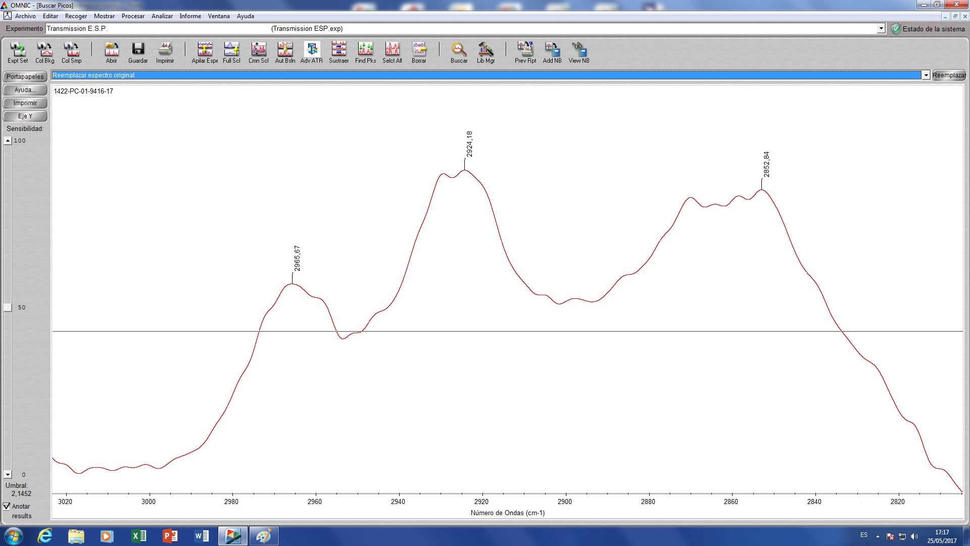 Grafica de la zona ampliada de 3000 a 2800 cm-1 donde se ven claramente los tres picos característicos de la resina epoxi.