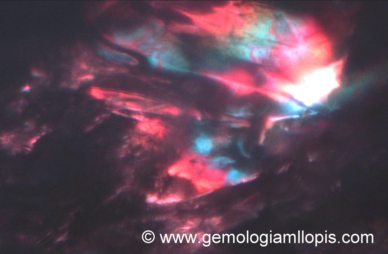 Sin embargo, nos llama la atención el hecho de que vista con el microscopio y con luz de camposcuro presenta muchos flashes de color azulado, posiblemente por una interferencia. Las interferencias se producen por capas de distinto I.R. y es lógico que cuando hay fisuras internas aparezcan cuando se observa la piedra con lupa 10x o con microscopio. Lo que no es tan lógico es que los velos azulados sean tan marcados, tan intensos y abundantes en todo el interior de la gema.
