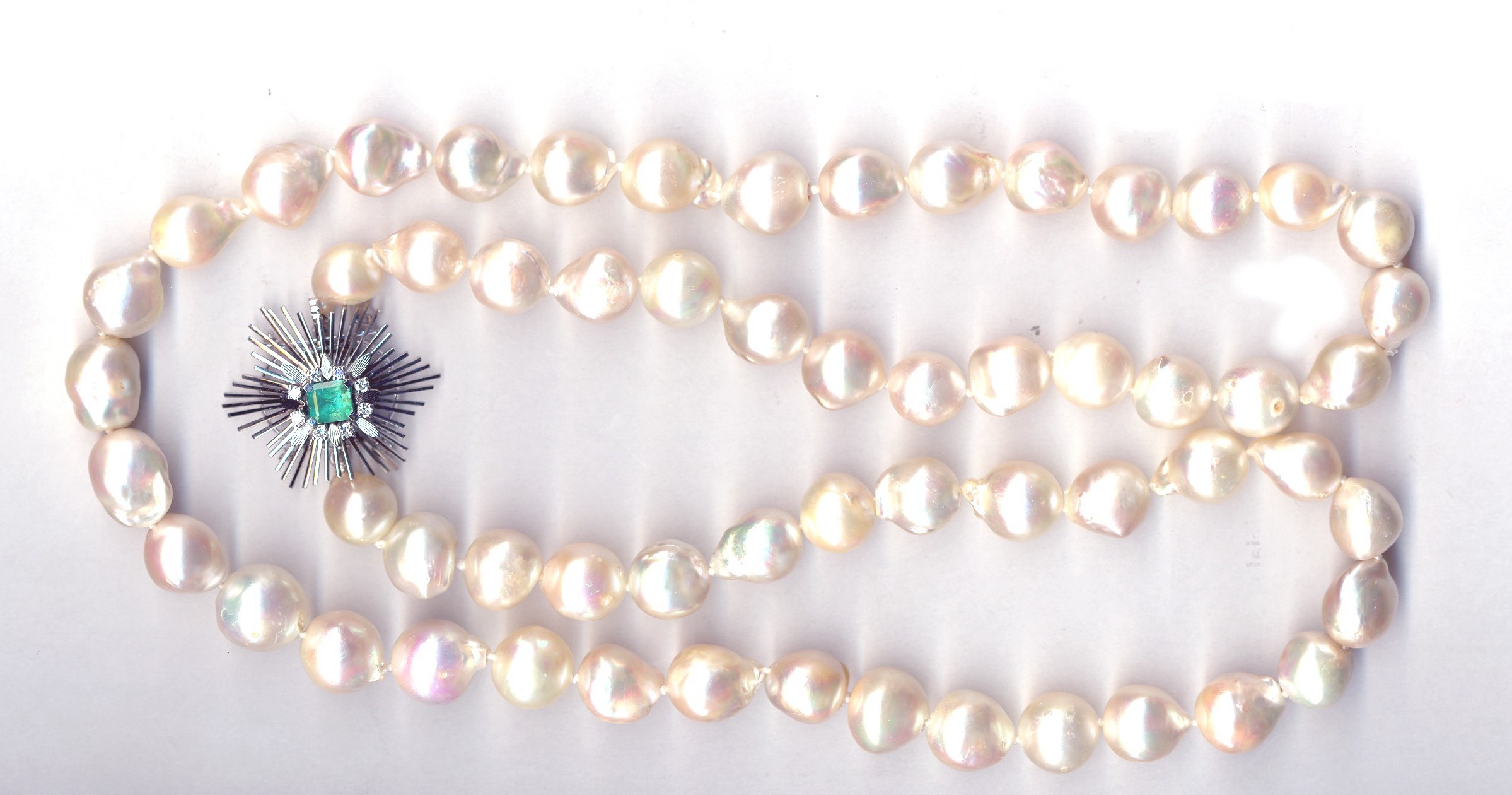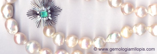 Ha llegado a nuestro laboratorio un collar de perlas barrocas cultivadas Akoya de los años 60, con un broche de oro blanco y en el centro una esmeralda que tras una rutinaria observación a través de la lupa de 10x se detectó que no se trataba de una esmeralda, sino de un berilo incoloro cubierto en su culata de un pegamento verde, haciéndola parecer desde la tabla y montada en el broche, una esmeralda de buen color.