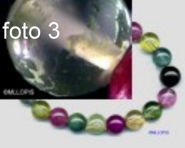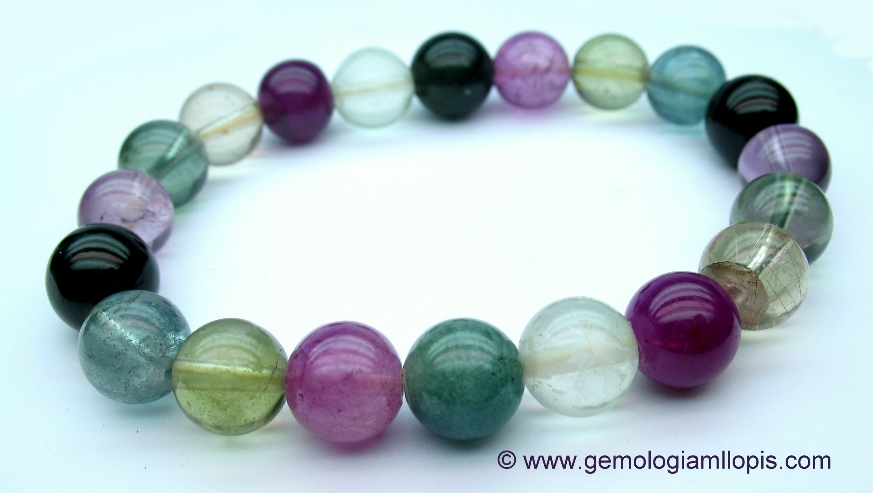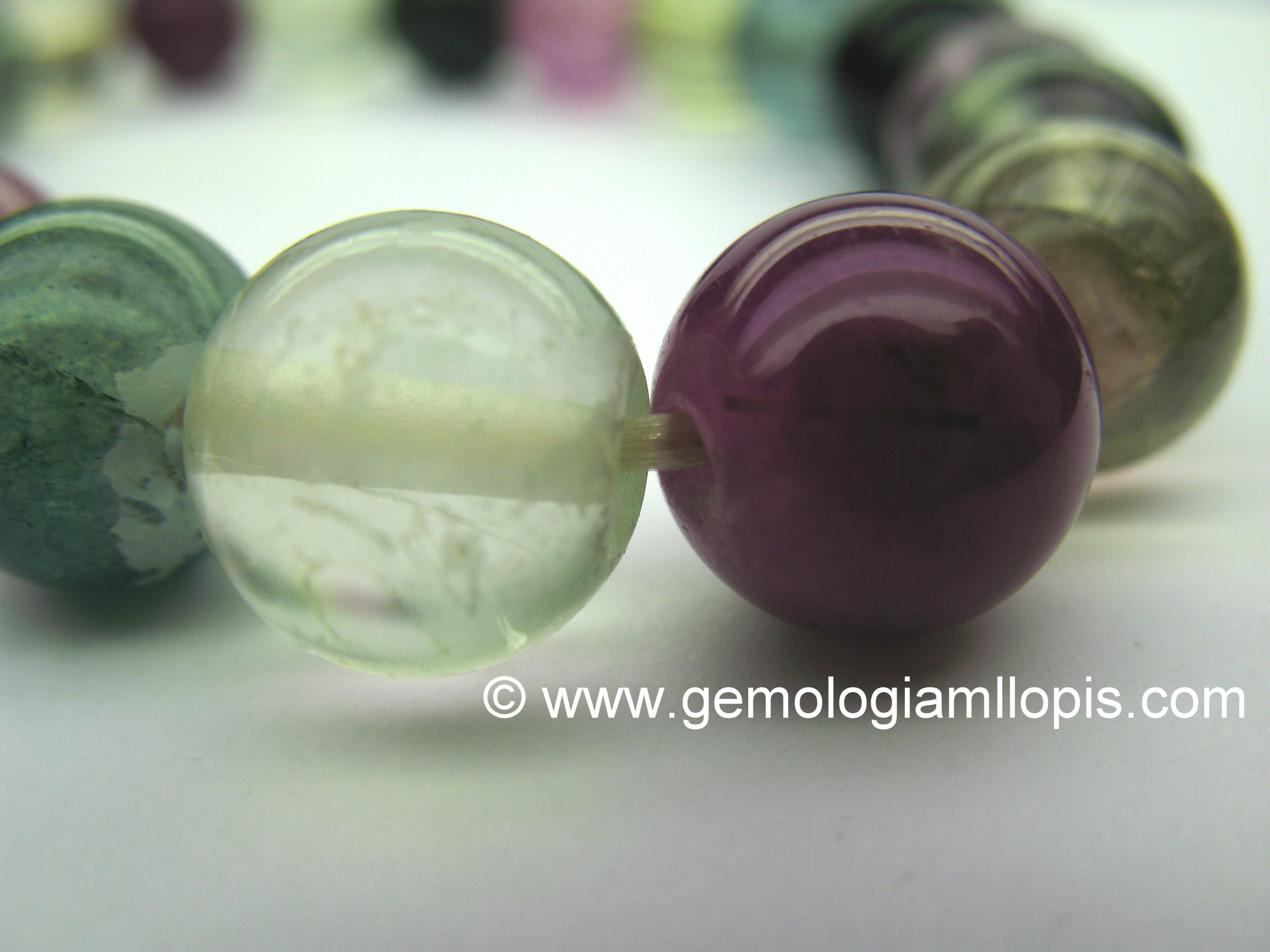 Otra sorpresa que recientemente nos ha llegado al laboratorio es un hilo de pulsera aparentando ser bolas de fluoritas o turmalinas que, al mirarlas detenidamente, se nos revela algo muy curioso: esas bolas están envueltas en una capa de color que fácilmente se despega y que se están vendiendo como fluoritas o turmalinas. En realidad se trata de cristal de roca que al estar lacadas en diferentes colores, el aspecto podría confundirse con piedras como la fluorita o la turmalina. Me llama mucho la atención que minerales como estos sean imitados cuando la naturaleza aporta gran cantidad de ellos y a módico precio en casi toda su variedad de colores. Es deleznable que existan en el mercado materiales como éste sin que conste en su etiqueta lo que verdaderamente son. Quiero transmitir con estas líneas que independientemente del material del que se trate, ha de estar correctamente indicado, para el bien de aquellos ojos inexpertos que compran piedras, y puedan saber de antemano lo que realmente se llevan a casa. No critico la diversidad de productos comerciales. Hago hincapié en la nomenclatura, a veces, tan confusa que se les da a algunos materiales que evocan pensar la compra de algo natural, no siéndolo ni en su más remota apariencia. Para ello, existe una normativa CIBJO que se encarga de llamar a cada cosa por su nombre, aclarando si se trata de una síntesis, imitación o si ha sufrido algún tipo de tratamiento, etc. Esta normativa, el laboratorio MLLOPIS la sigue lealmente en todos y cada uno de sus certificados y se hace especial mención en todos los cursos que impartimos para que todos aquellos que deciden aprender con nosotros sepan y compartan nuestro empeño de nombrar debidamente a todo material que existe en el mercado.
