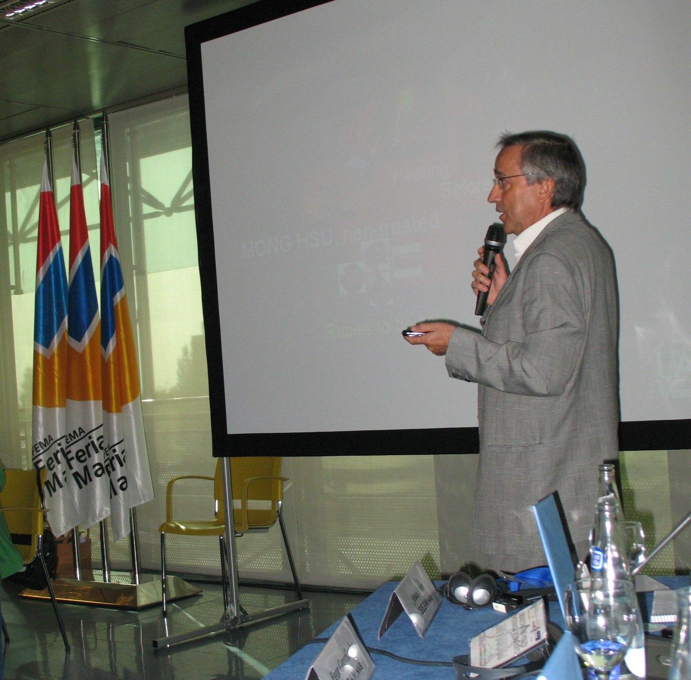 El Catedrático de Mineralogía de la Universidad Autónoma de Madrid Don Tomás Calderón en su intervención sobre «caracterización de corindones (rubí y zafiro) dopados con berilio» Prodiam 2008