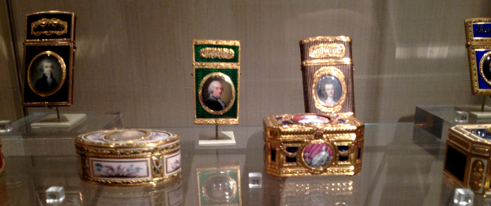 Algunas vitrinas mostraban cajitas para sellos de lacre (Sealing Wax Case) , estuches, tabaqueras (Snuffbox) y pitilleras realizados en oro con esmaltes, marfil, vidrio, diamantes, rubíes, etc. exquisitas y refinadas, muy bellas. Constituyen regalos de hombres a sus esposas o viceversa.
