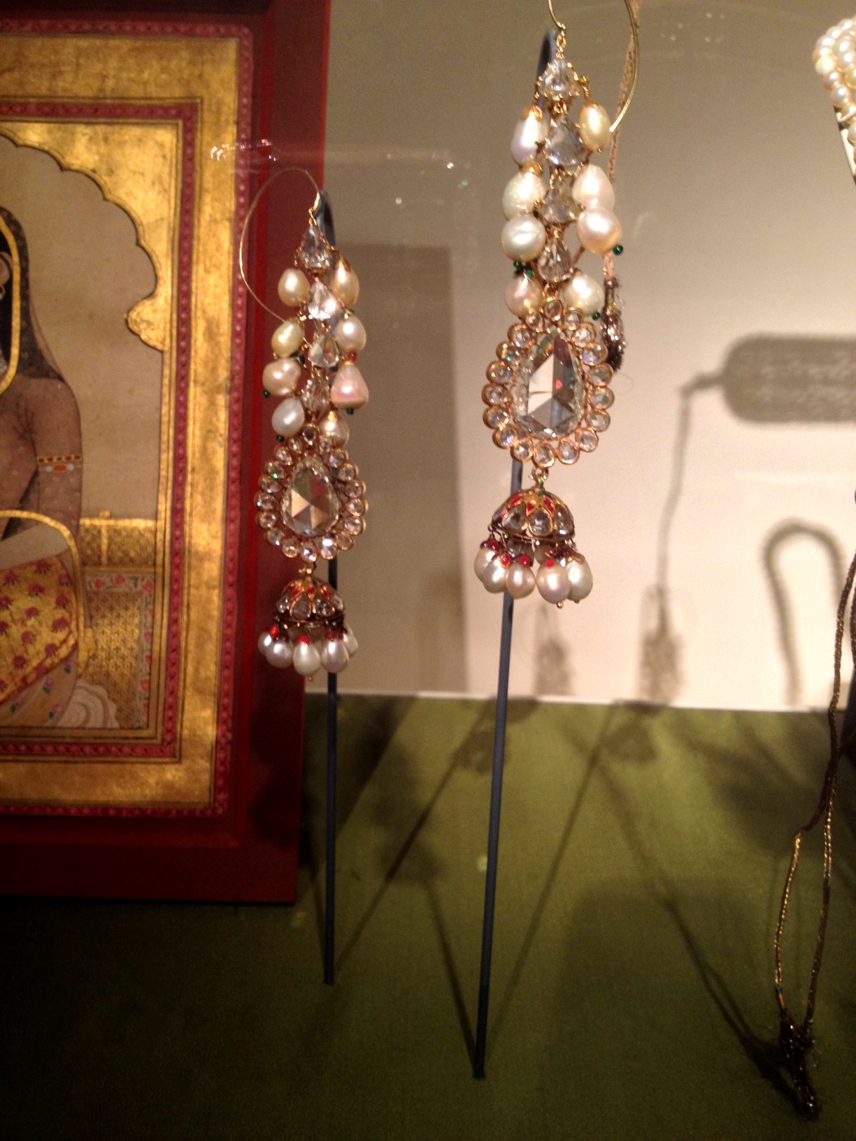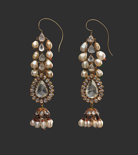 Maravillosos estos pendientes del siglo XVIII de Deccan India, realizados en oro con diamantes de talla rosa y contorno pera, esmeraldas, perlas y esmalte. Son de casi 10 cm de largo y pertenecen a un coleccionista privado de Nueva York.