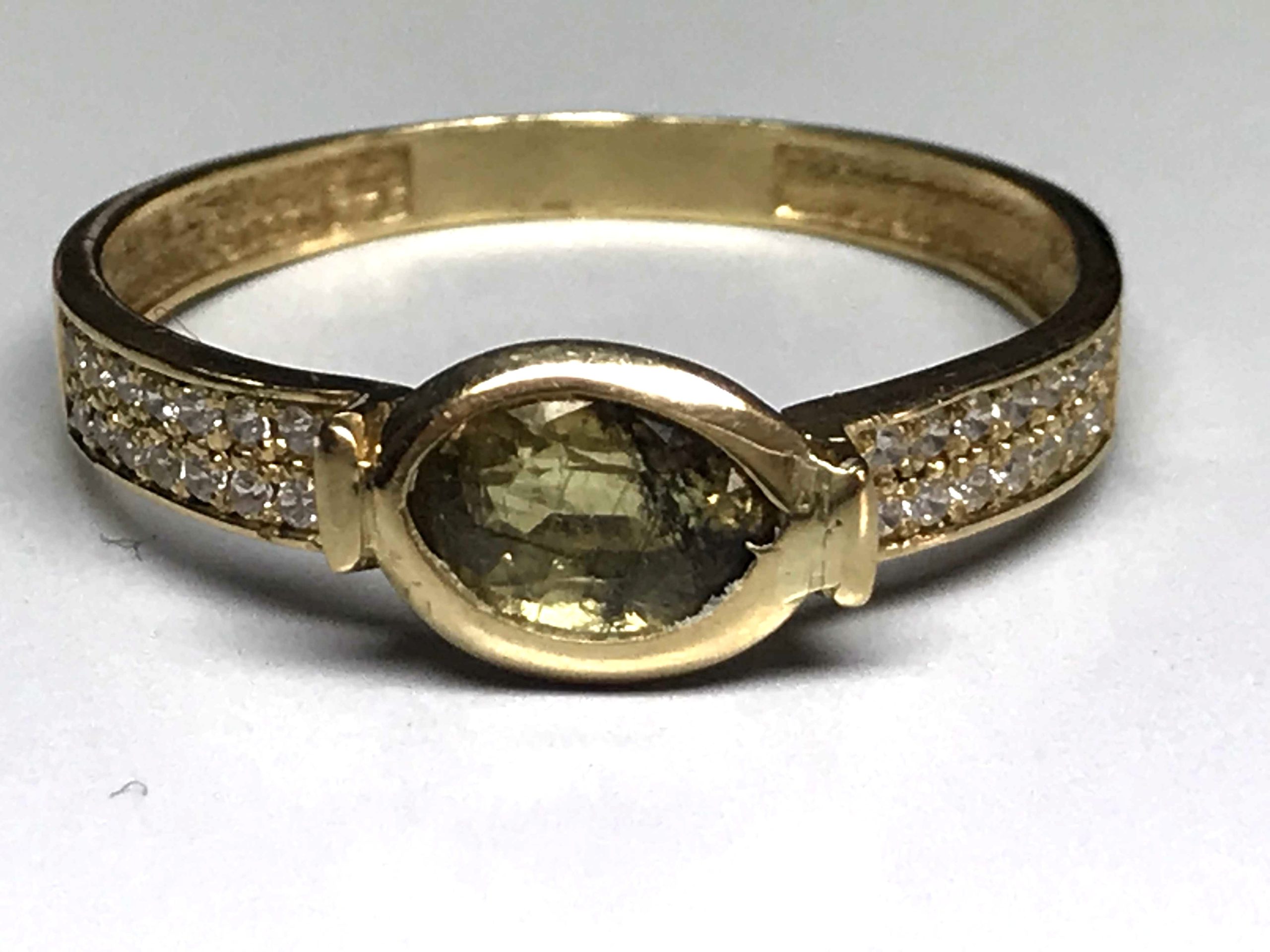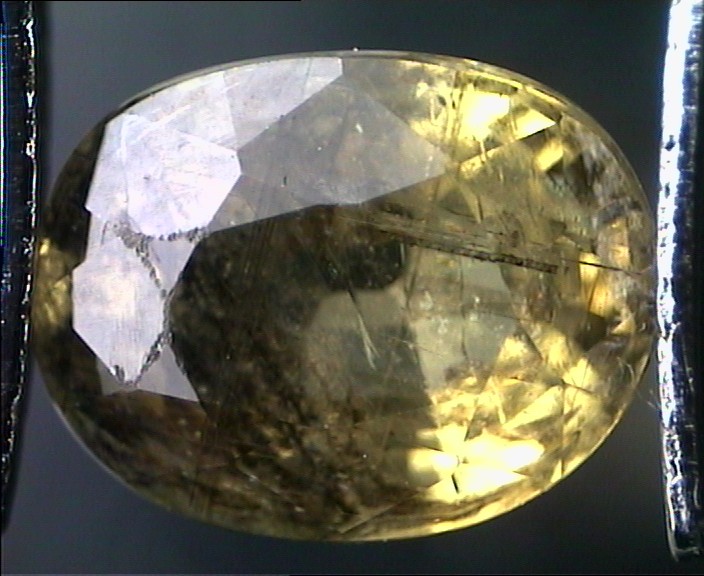 Parece ser que cuando el joyero hace la montura oval para engastar en chatón el zafiro amarillo, primero engasta en la montura la piedra y luego suelda esta al anillo. Cuando suelda la montura expone al calor, al menos 350º a 400 º , tanto la montura como la piedra, con la confianza de que como es un zafiro, no le va a pasar nada.  El resultado es desastroso, porque el vidrio de relleno que se emplea es de bajo punto de fusión y lo que hace literalmente es carbonizarlo, se queda negro todo lo que es el relleno. Lo que ha pasado es que todo lo que antes era relleno y no se veía porque servia para disimular las fisuras, ahora está negro carbonizado en el mismo sitio, en las mismas fisuras.  Lo que no entendemos es por qué el joyero no soldó la montura al anillo y después la engasta, de esta manera no hay que ponerla al fuego y es la forma normal de hacerlo.