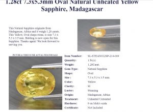 Nos visita  un cliente que compra un zafiro amarillo natural por Internet. Los datos que le facilitan y le dan confianza para comprarlo, son un vídeo y  un informe en el que dice las características de la piedra. Dicho documento dice «Zafiro amarillo natural sin tratamiento»,  lleva una foto, datos de medidas, peso, tipo de talla, procedencia  y en un apartado muy abajo dice con letra pequeña que «este documento no es un certificado, que el certificado no está incluído».