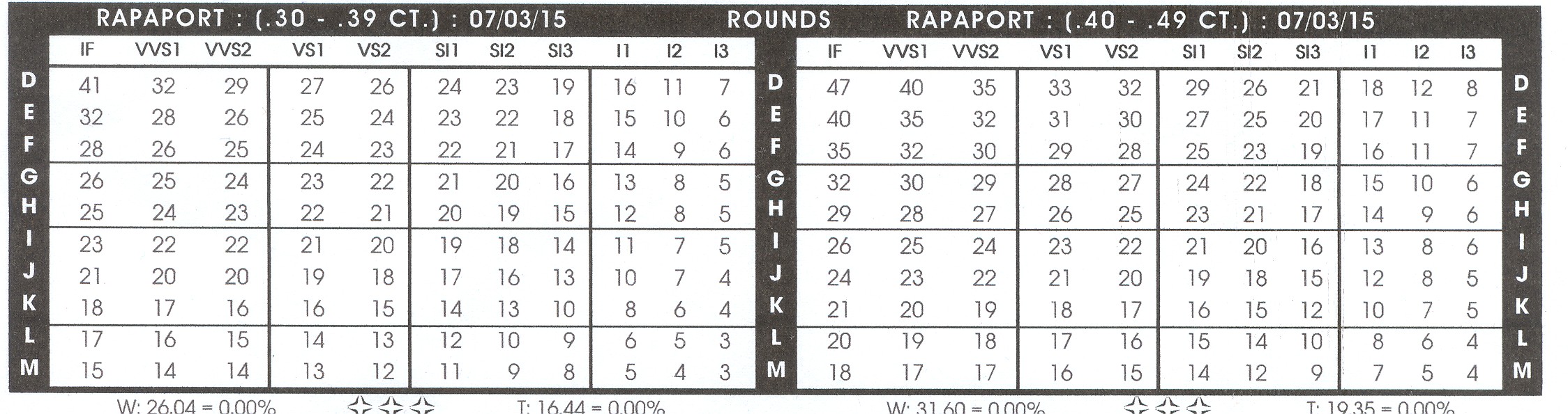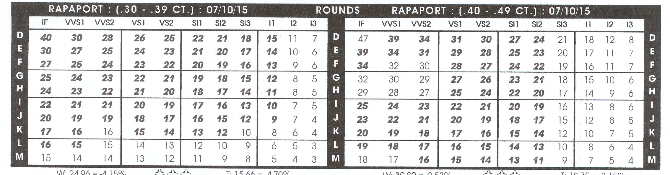 El listado de precios de Rapaport a fecha 7 de julio de 2015 resalta una bajada de precios a los profesionales de entre un 3% y un 10% en las tallas redondas en algunas de las calidades desde 0,30 ct hasta 3,99 ct. . Esto se puede apreciar en los listados observando que los números aparecen en negrita y cursiva para decirnos que ha habido una bajada de precio con respecto a la lista anterior.