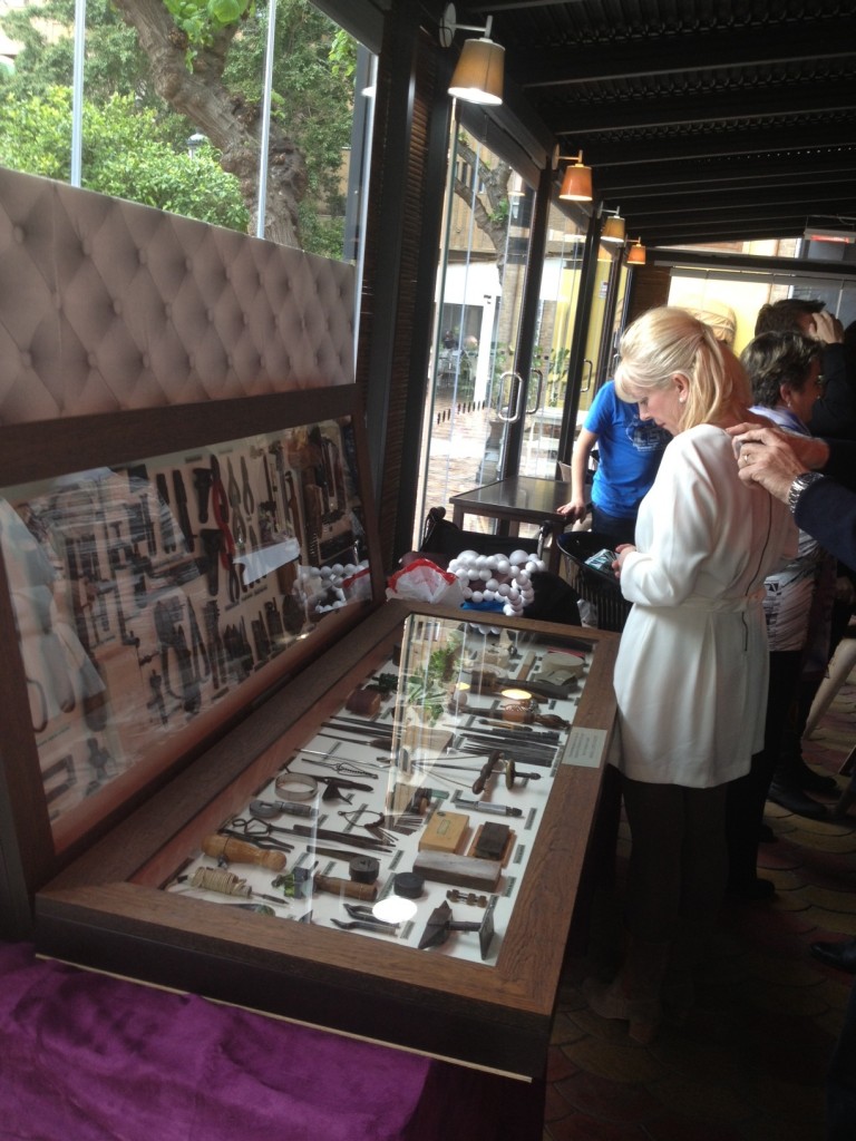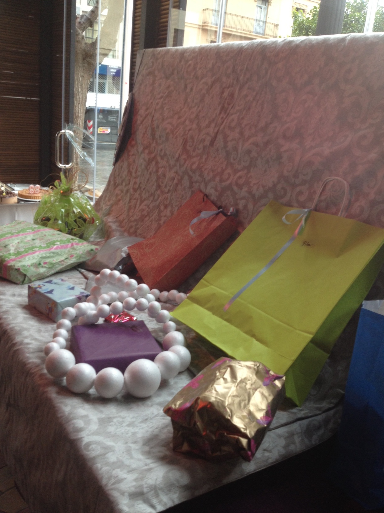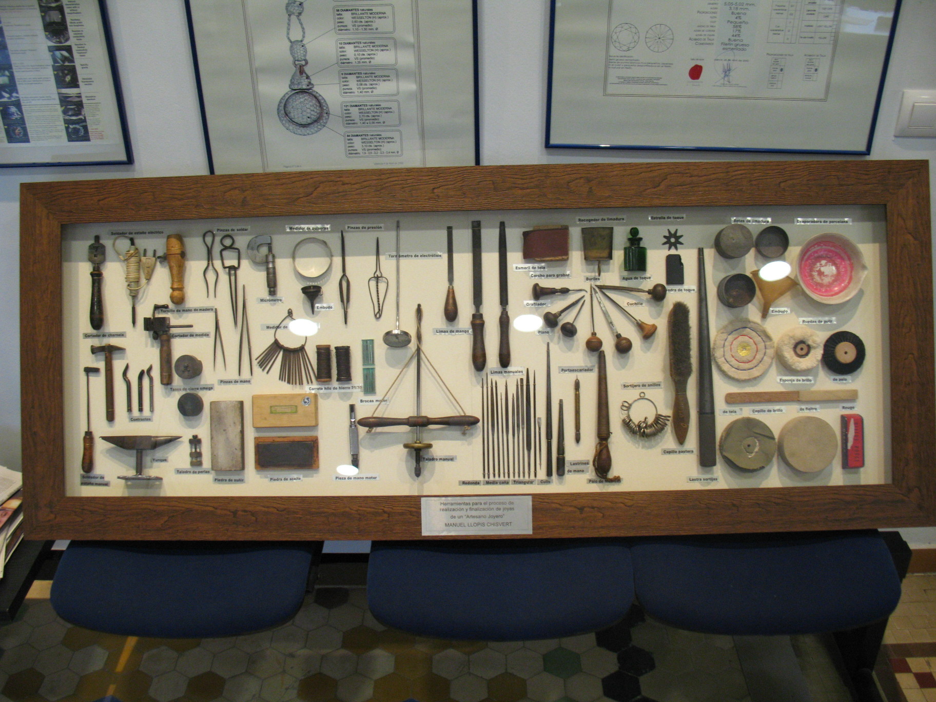 En una mesa auxiliar dispusimos los regalos de cumpleaños. Los colocamos encima de unas telas estampadas, sin que el anfitrión lo supiera, tapaban los murales de sus herramientas de toda su vida profesional. Estas herramientas forman parte de un montón mas, que el hombre ya sin poder usarlas por no tener fuerzas, con su vista mermada, y con su mano derecha inmóvil por una parálisis, las tenía en cajas guardadas y casi a punto de tirar.