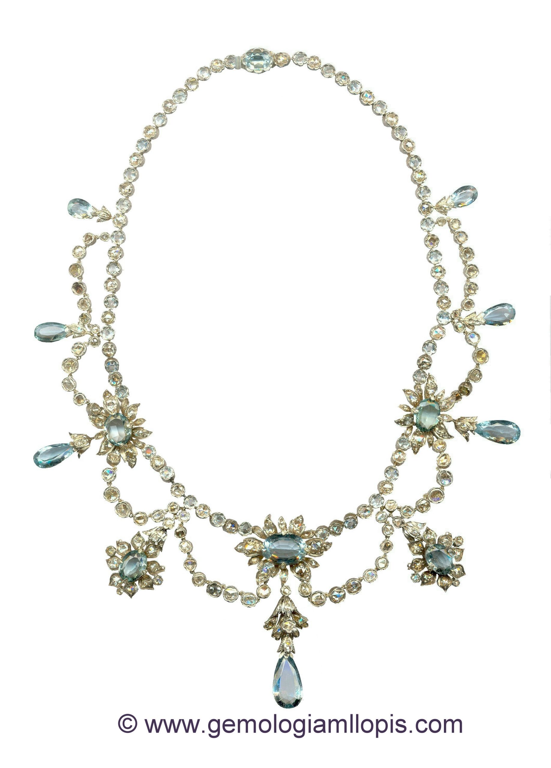 Collar isabelino de diseño floral con aguamarinas y diamantes, restaurado.