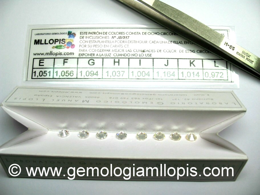 A continuación y con la ayuda de un patrón de color, que lo normal es tener un patrón de diamantes de un tamaño de 6 a 6,5 mm de diámetro equivalentes a piedras de 0,90 ct a 1,00 ct. y con pocas impurezas, también los hay de circonitas graduadas con los colores equivalentes a los de los diamantes, el gemólogo observará por comparación con el patrón y bajo iluminacion de «luz de día» el color y lo anotará en la ficha.