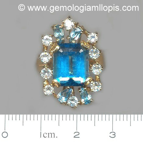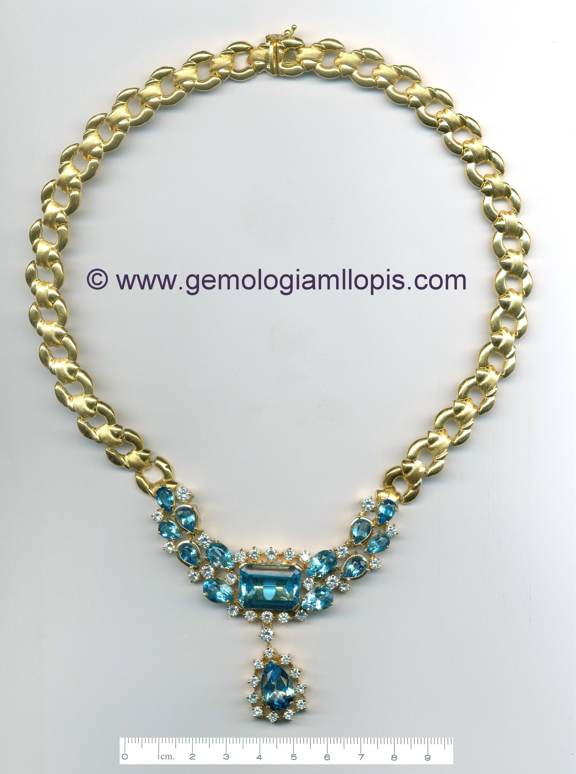 Nos disponemos a estudiar sus piezas y en el caso de las piedras grandes, los centros de los pendientes de la sortija y los dos del collar, nos permite sin necesidad de desmontar las piedras, colocarlas en un refractómetro y comprobar su índice de refracción. En los cinco casos es de 1,610 y 1,620 con una birrefringencia de 0,010. Este índice corresponde al topacio, no al de una aguamarina. En el caso de las piedras azules pequeñas, mandamos el aderezo a nuestro engastador para que desmonte con cuidado varios ejemplares de muestra y asi poder ver también su índice de refracción. En las seis muestras desengastadas las lecturas dieron exactamente el mismo resultado, topacios.