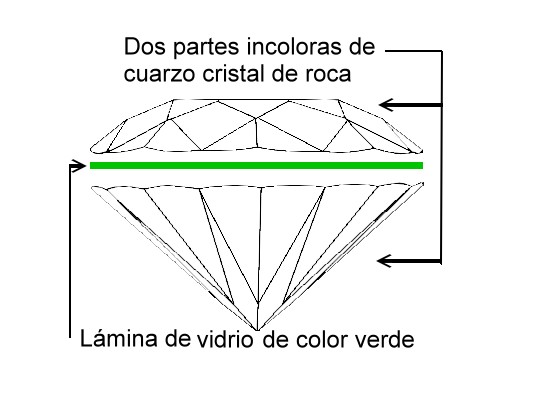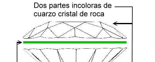 Esquema de la descripción de las partes de un doblete de cuarzo cristal de roca comercializado como «Esmeralda Soudé»