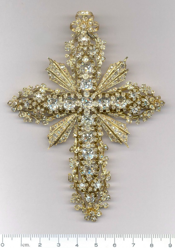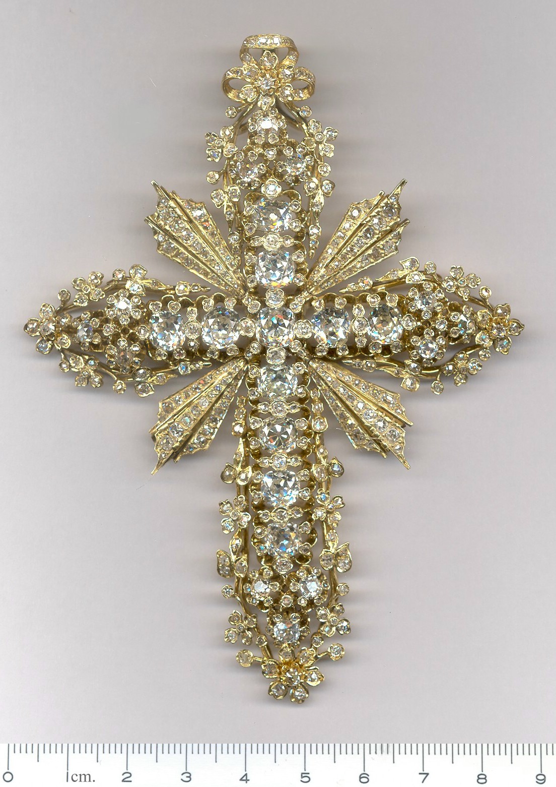 Espléndida cruz pectoral con diamantes, un trabajo de joyero y de engastador espectaculares, amén de que hay que darle un diez al diseñador. Bajo un diseño floral, se ha ejecutado sobre armazones de hilos que se enlazan con pasadores y están cazados con soldadura de estaño, de tal manera, que con un poco de calor se puede desmontar a piezas.