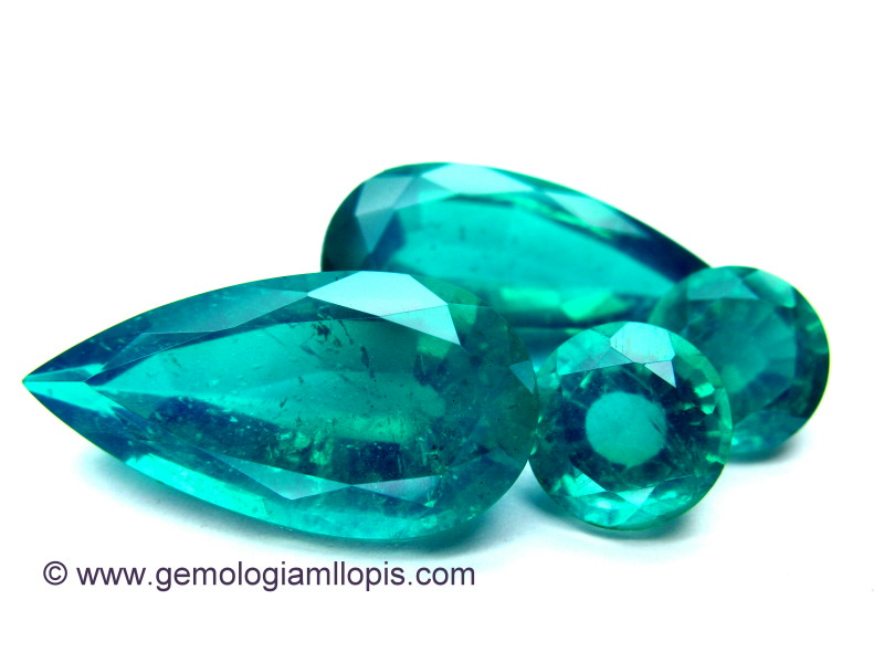 Dobletes esmeralda soude (cuarzo cristal de roca con pegamento verde) despegados. Se aprecian las lagunas o pequeños planos de vacío en la zona del pegamento, de la misma manera en las cuatro piezas.
