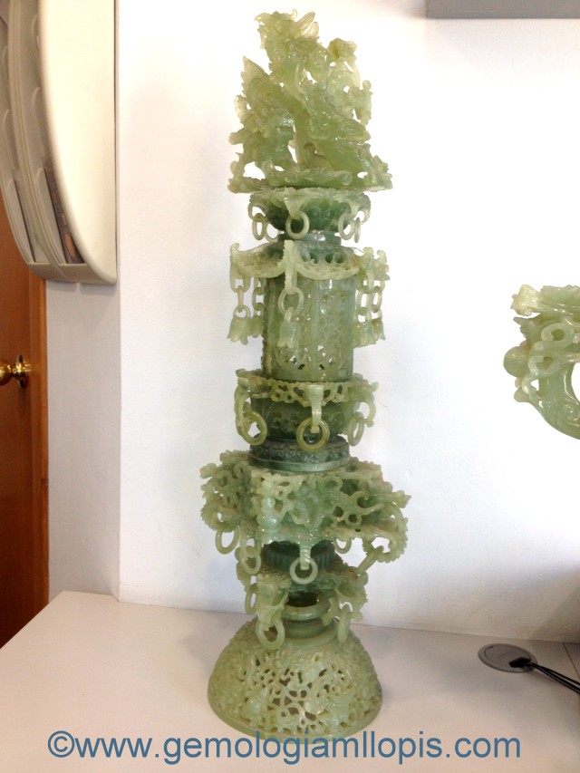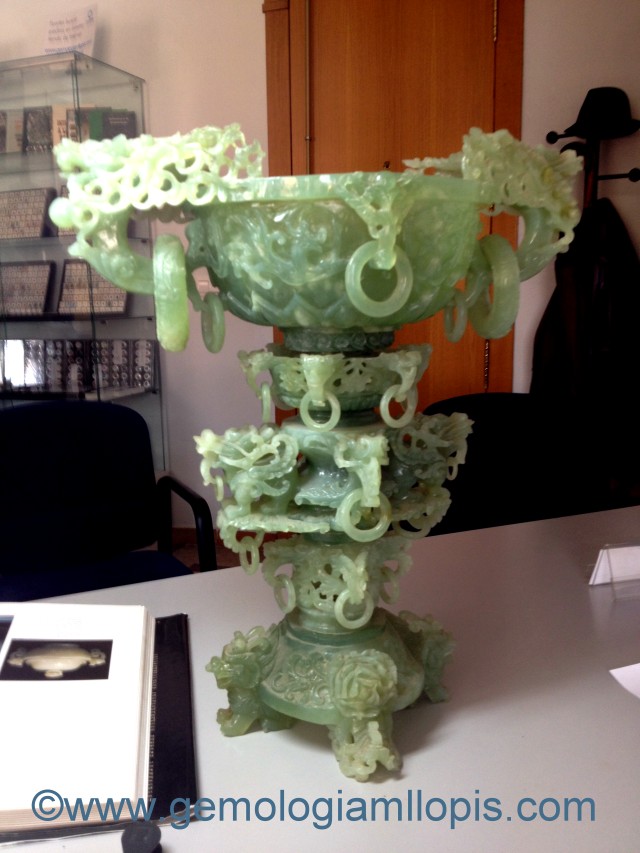 La pieza en cuestión es un gran jarrón construido a piezas y con una altura de 1,50 metros. Es notable el hecho de que todas las asas que cuelgan se han realizado sin ensamblajes, desde el mismo material. Vamos a estudiarla y documentarla. Peso, medidas, fotos de los detalles, tipo de manufactura, antigüedad, que material es, ¿es jade? o ¿es una imitación en otro mineral?, esta es la cuestión mas importante y que mueve a ambas partes a averiguarlo. La pieza tiene en sí mismo un valor por su trabajo, si además el material de la que se compone es valioso, mejor que mejor. ¡Vamos a estudiarla!.