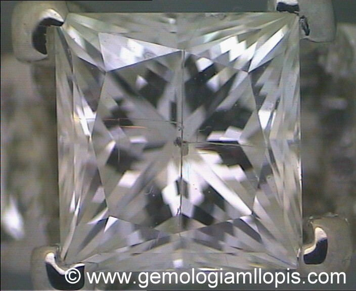 Este caso curioso que muestro es ya el colmo, llegar a hacer los dos tratamientos en la misma piedra. Se trata de un diamante natural de talla Princesa cuadrada de 0,90 ct. en el que se aprecian unas fisuras en cruz, perpendiculares a el plano de la tabla que llegan hasta la superficie, al igual que se puede ver un muy pequeño orificio de entrada en la tabla en dirección hacia el culet y que termina en una inclusión que entendemos  que antes era negra.