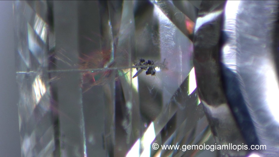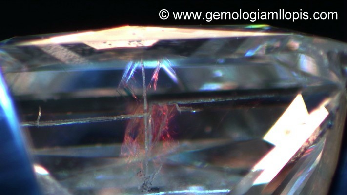 Hay que ser minucioso con el manejo de una lupa gemológica 10x y no quedarse con la primera vista. Si la montura lo permite, hay que ver la piedra desde diferentes posiciones y perfiles, porque a veces no se ve si no la  movemos para poder ver los reflejos e irisaciones que producen los tratamientos de relleno de vidrio y los agujeros y el haz que hace el láser en su camino hasta llegar a la inclusión. Muchas veces, como es el caso de esta piedra, las fisuras son perpendiculares al plano de la tabla de la piedra y además el haz láser también y esto hace que no se vea o se vea muy poco desde  arriba o en posición directa a la tabla de la piedra.