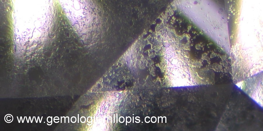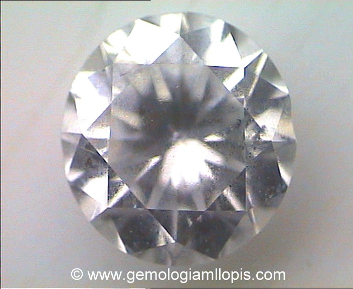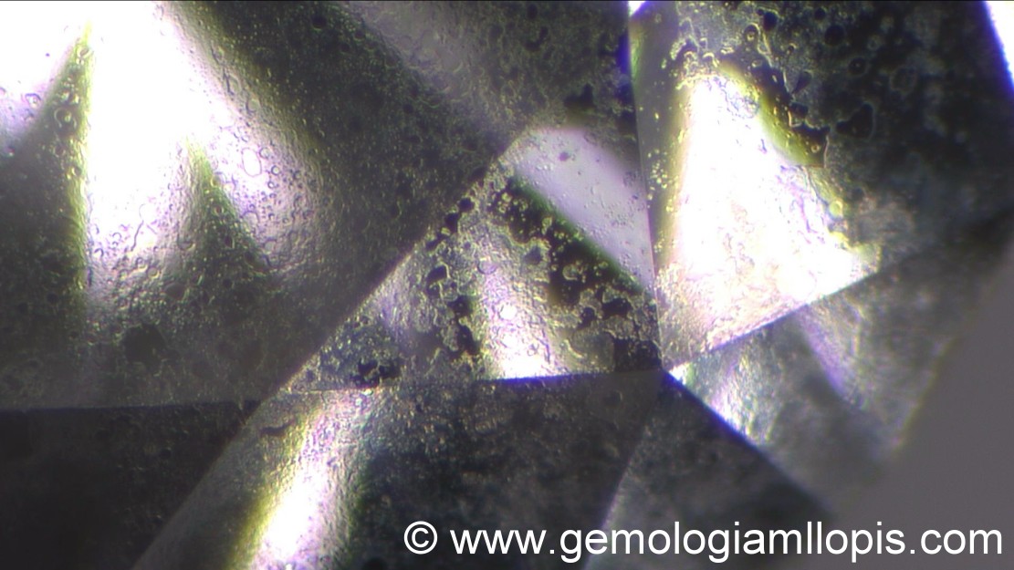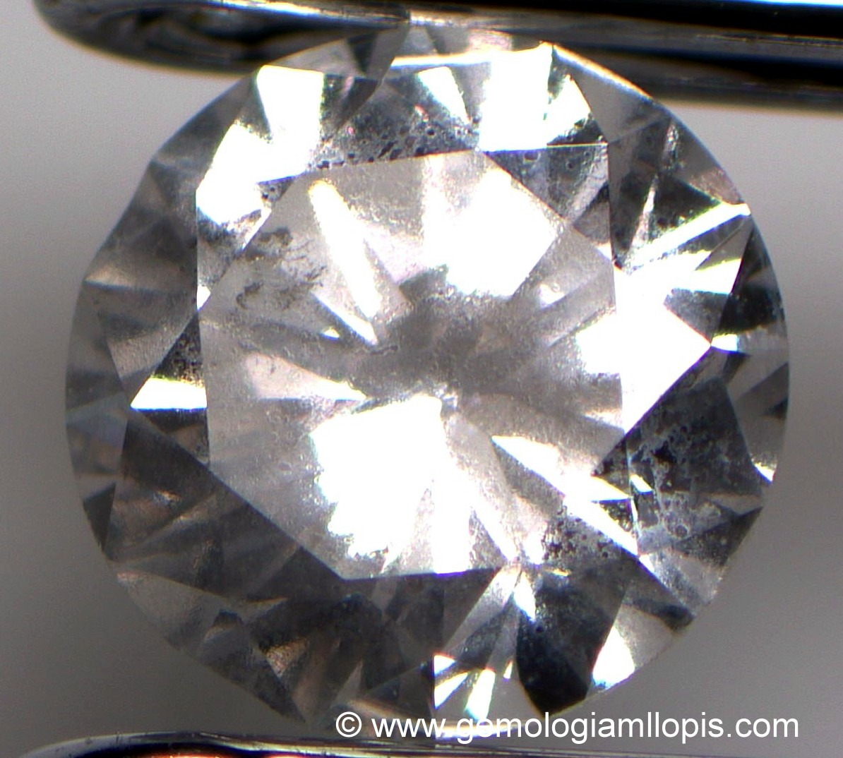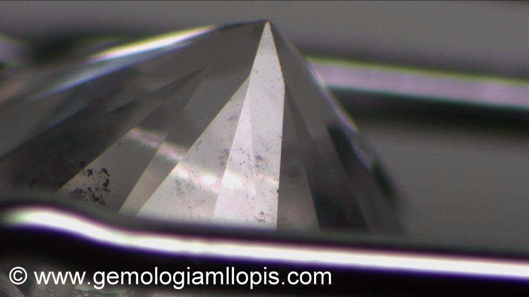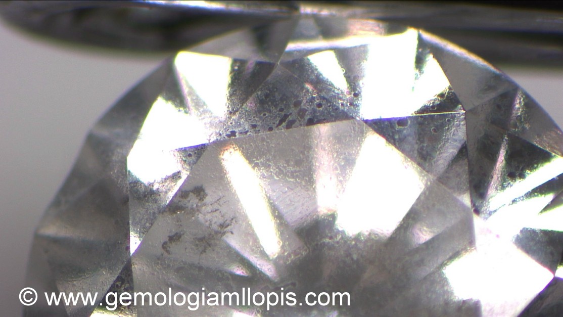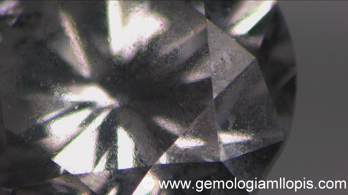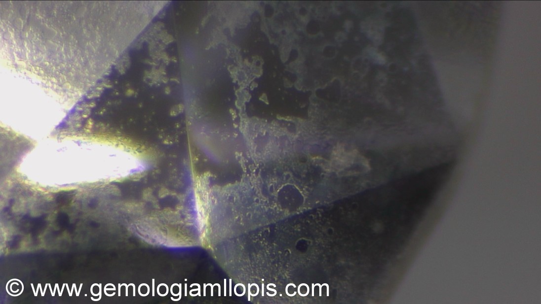 El joyero observa con estupor que el diamante se ha quedado mate y teme que se haya fisurado. Lo observa detenidamente con su microscopio para engastar y se da cuenta de que es superficial. Lo desengasta para poder hacerle la limpieza mejor. Observa que por la corona tiene mas recubrimiento que por la culata. Suponemos que al estar montado y aplicarle los líquidos, estos se depositarían con mas facilidad arriba que abajo. Intenta limpiarlo, poniéndolo en ácido sulfúrico, después en un bombo de palillos de acero, en alcohol. El resultado es lo que se ve en esta imagen. Desesperado porque no sabe que hacer nos llama para contarnos el problema y ver si podemos ayudarle. Trae el diamante al laboratorio y lo deja para que podamos recuperarlo, quitarle esa pátina superficial y devolver su brillo y aspecto original, pues no se lo puede devolver al cliente en ese estado. En alguna ocasión, le contamos que ya habíamos tenido experiencia con otra piedra y la recuperamos. El motivo fue diferente, pero la recuperamos.