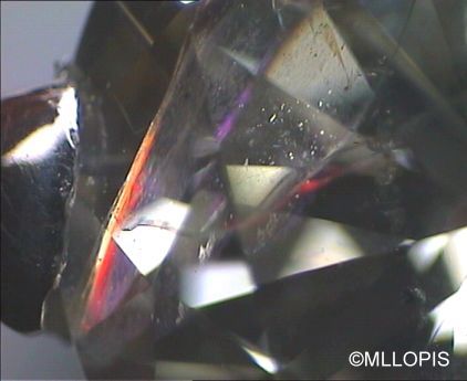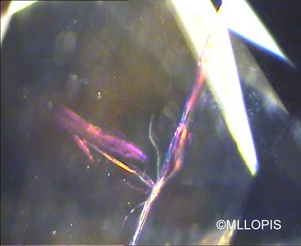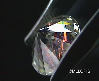 Ultimamente se han detectado en nuestro laboratorio algunos diamantes rellenos de vidrio. Técnica que se emplea para mejorar su pureza. No es difícil detectarlos para un ojo entrenado, pues se observan irisaciones onduladas como velos, con colores fuera de lo normal, localizados, verdes azules y rojos generalmente, son las irisaciones que produce el vidrio en la fisura que ha rellenado.