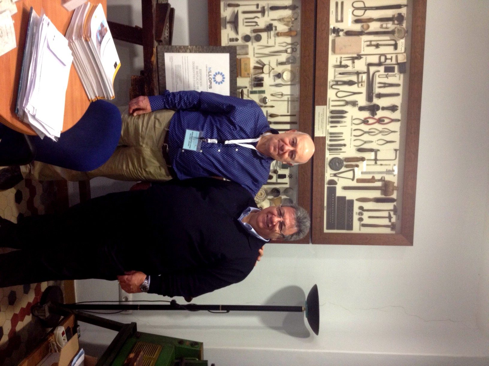 Mostró un especial interés por unos cuadros de herramientas de artesano joyero, de mi padre que tenemos colgados en un mural de nuestras instalaciones con motivo del 88 cumpleaños de mi padre Manuel Llopis Chisvert.