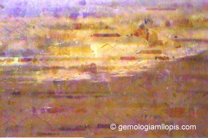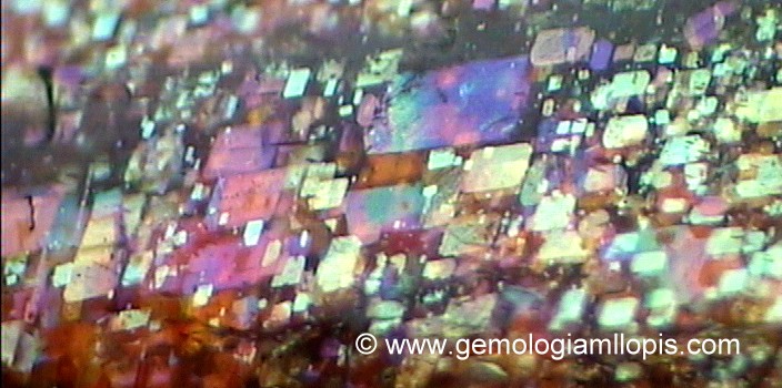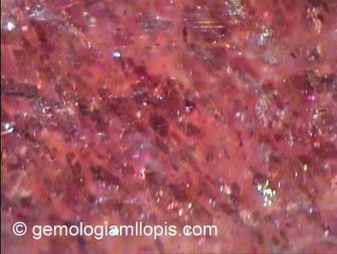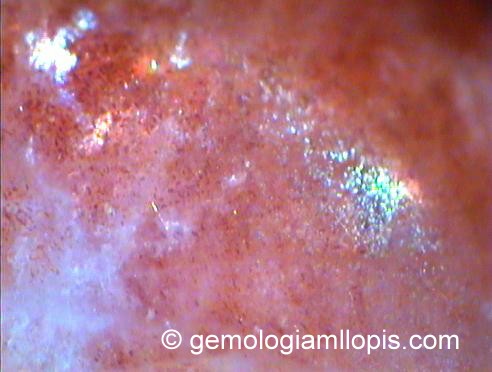 En el mismo ejemplar visto con más aumentos podemos apreciar claramente las placas de color rojizo incluidas en la gema.