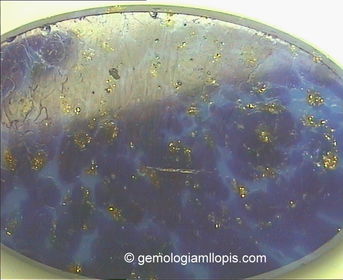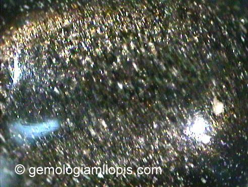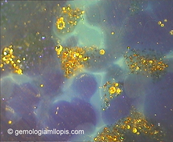 Tampoco debe confundirnos las inclusiones metálicas que reflejan la luz en algunos vidrios artificiales. Esta otra imagen es de un vidrio que contiene pequeñas inclusiones metálicas de color dorado que reflejan la luz.