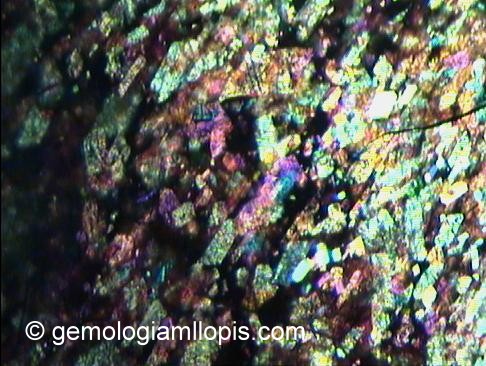 En otro ejemplar de piedra sol las placas de goethita y hematite se ven tal y como muestra esta fotomicrografía.