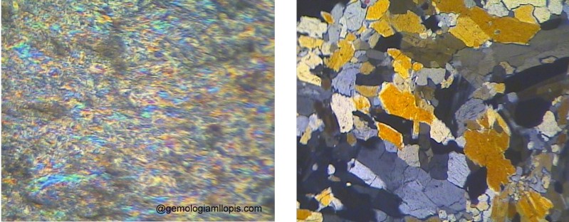Láminas finas de microcristales de nefrita y jadeíta entre polarizadores cruzados. La imagen de la izquierda cristales corresponde a la textura fibrosa de la nefrita, a la derecha vemos la textura granular de la jadeíta