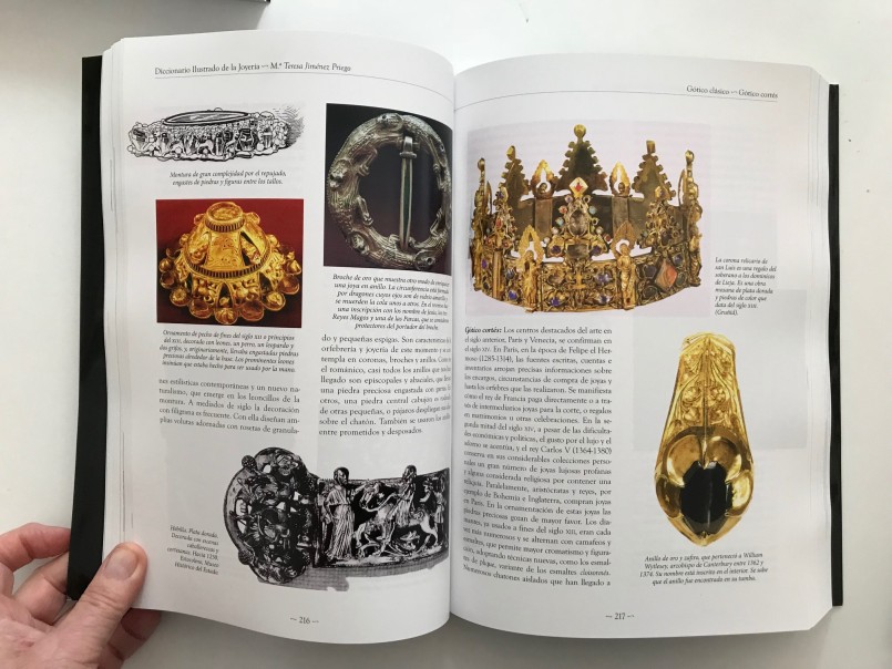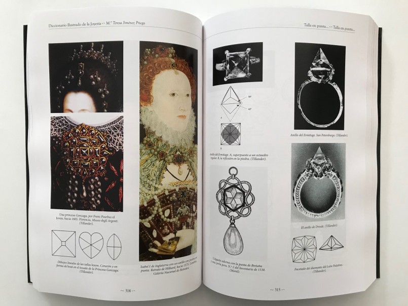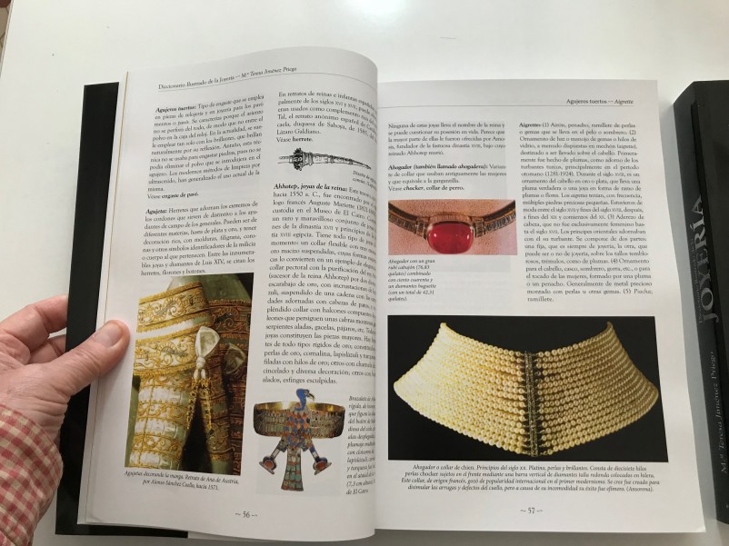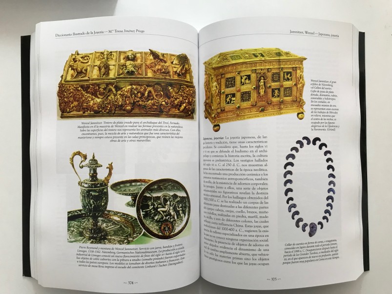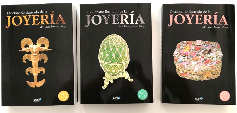 Grandísima obra de María Teresa Jiménez Priego. Sin duda este Diccionario de Joyería contribuirá a enriquecer,  mantener y prolongar en el tiempo los conceptos y conocimientos  de joyería.  Se presenta en tres tomos de gran formato con tapa blanda. Gran profusión de fotografías, esquemas, planos, mapas, gráficos, bocetos, etc. a color y en blanco y negro. Nomenclatura de joyas, de piedras, de herramientas de joyero, de engastador, tipos de engastes, aleaciones de metales, estilos de tallas, .., etc. y un sin fin de términos. Además tiene un apéndice de términos usados en la joyería de los siglos XVII y XVIII, otro apéndice de la evolución de la joyería inglesa , otro con mapas de yacimientos, minas, migraciones y movimientos de culturas. Un cuarto apéndice con la cronología de Fabergé.  Otro con la cronología de las tallas, su evolución.  Índice de palabras.