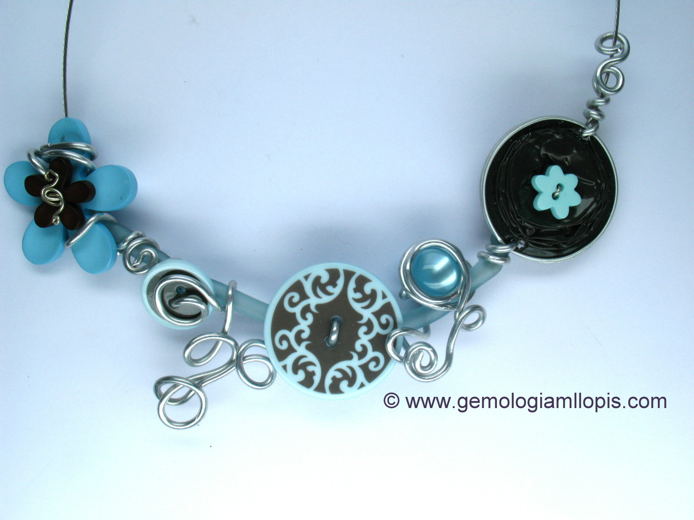 Hace unas semanas, en uno de nuestros cursos de enfilado clásico, conocí a una alumna, española de nacionalidad pero afincada en Suiza, que nos enseñó sus creaciones con estos materiales que os comentaba. La chica tiene experiencia en este tipo de enlaces de cuentas y telas, «punto peyote», «punto de malla», «peto indio» y otras técnicas, pero no tenía mucha experiencia en el enfilado clásico. Me llamó la atención su creatividad para hacer collares con materiales como mallas y flores de plástico, hilos de aluminio dorados, bolas y cuentas varias de vidrios de diferentes colores y formas.