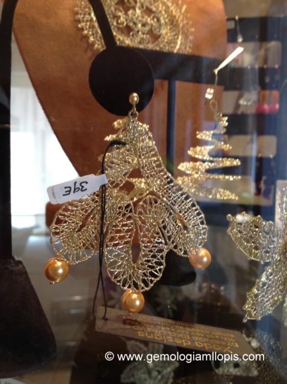 Otro día que fui a comer con mi padre a un Parador de Turismo, y en un escaparte de los que suelen tener para relojes, plumas, bolígrafos, joyas, piezas de marcas conocidas, etc. vi unas «joyas especiales». Me llamó la atención unos pendientes de «ganchillo» realizados en hilo dorado. Me pareció muy ingenioso a la vez que vistoso, original y claro, económico».