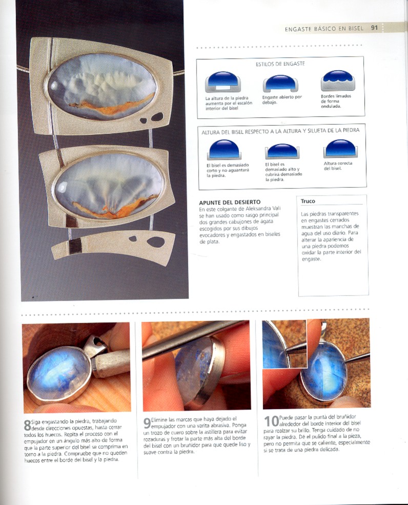 Este libro es una enciclopedia técnica general que muestra una amplia variedad de procesos de engastado de piedras, con información detallada sobre gemas y metales todo ello con ilustraciones a todo color mostrando el proceso de elaboración.