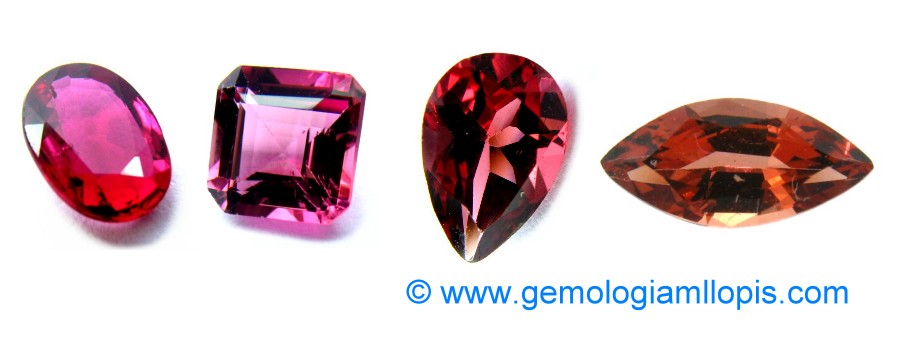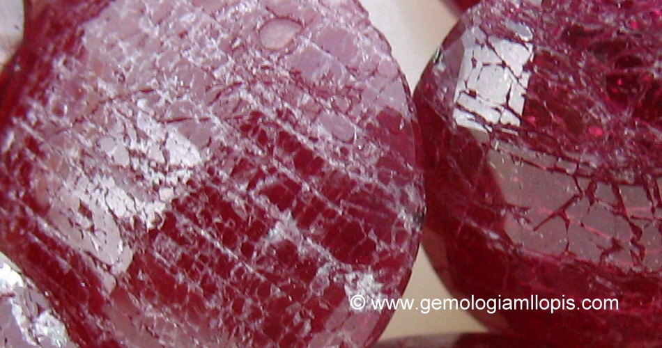 Rubíes rellenos con vidrio, deteriorados por ponerlos en un bombo de pulir con agujas