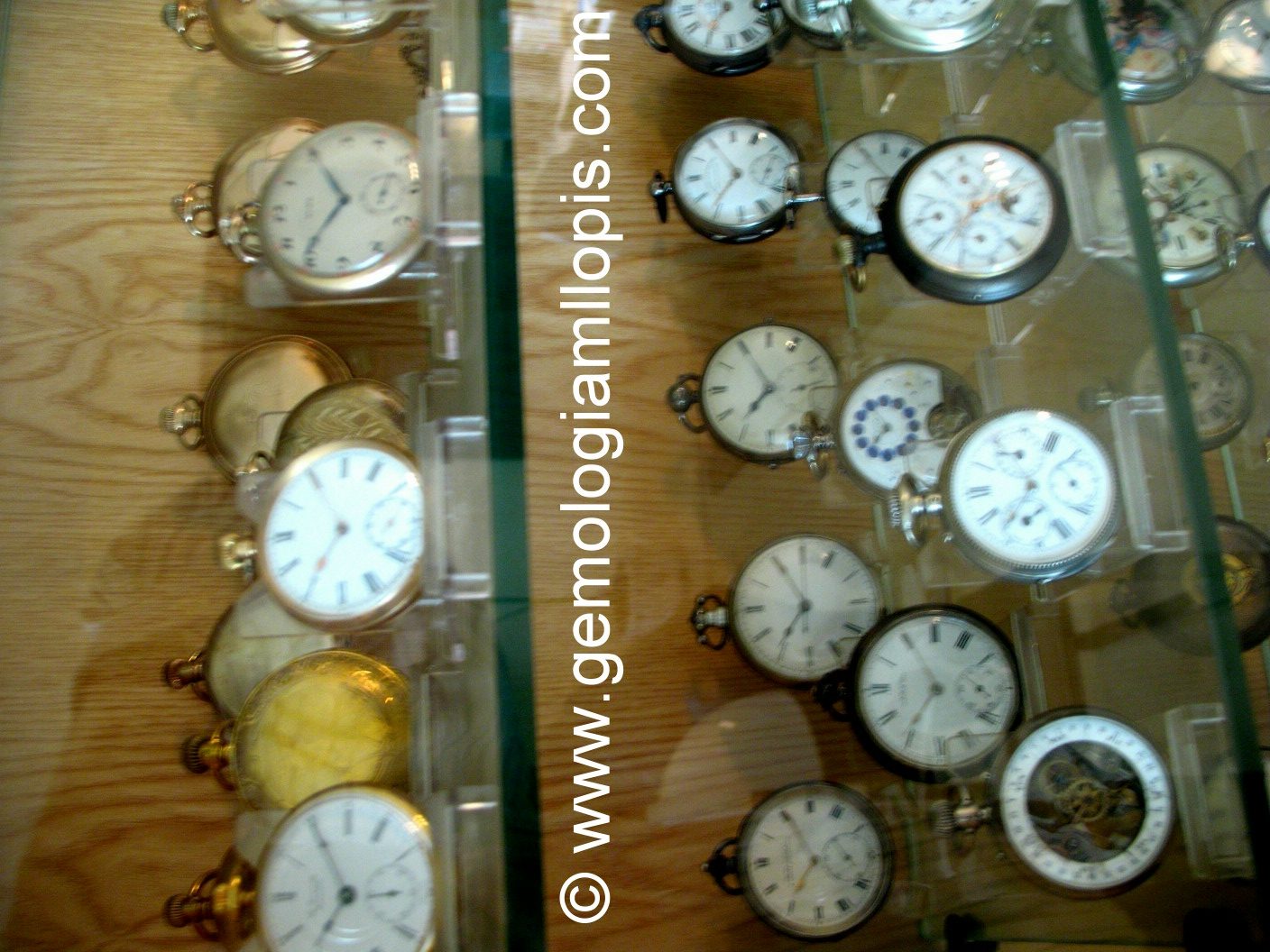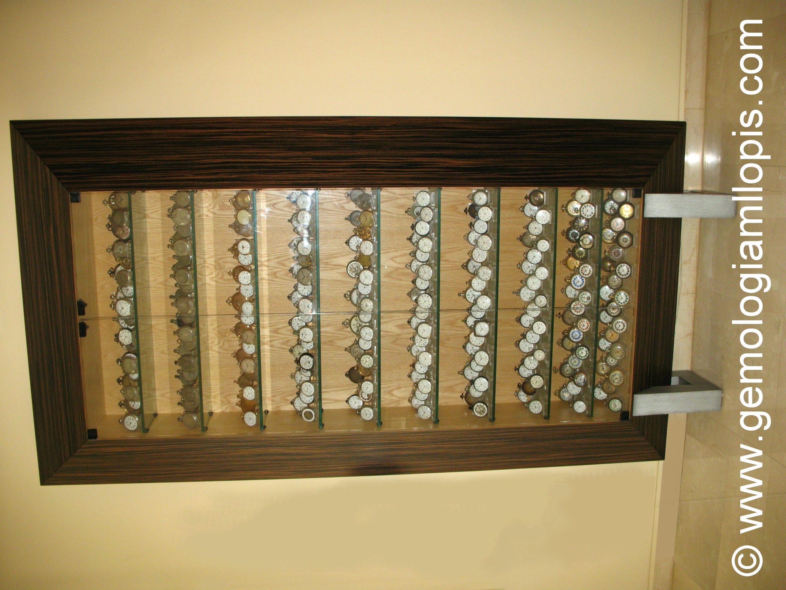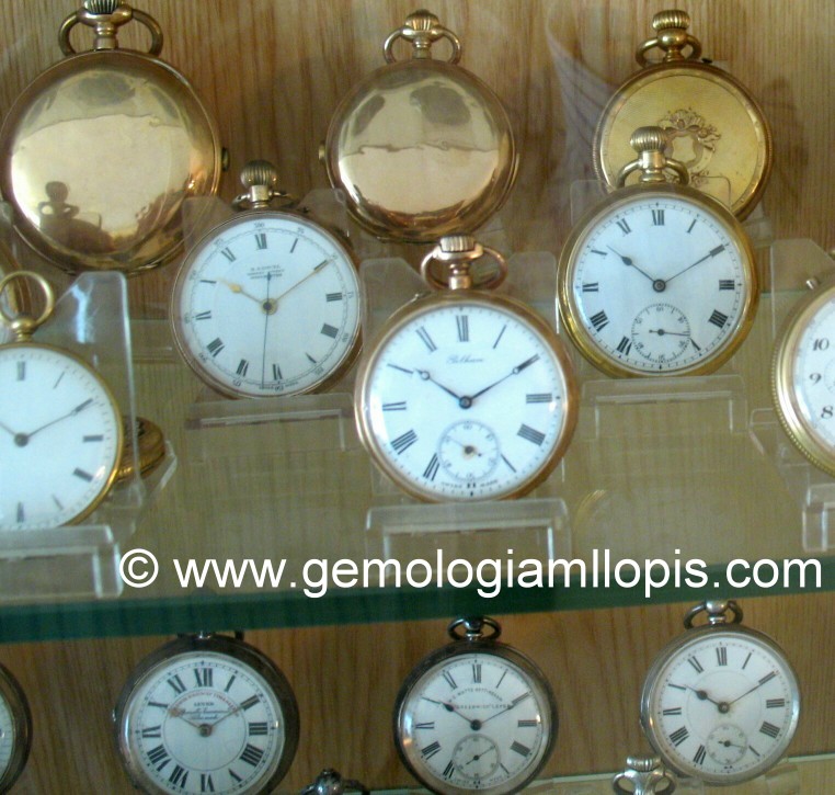 Recientemente, al realizar una valoración de joyas para repartir una herencia entre cuatro hermanos, hemos podido admirar una exquisita colección de 250 relojes de bolsillo, del tipo Lepine y Saboneta, de plata y de oro, de gran complicación, autómatas, con esmalte, con grabados, etc. Esta colección particular, propiedad de uno de los hermanos, llamó nuestra atención por varios motivos: lo extensa de la colección, 250 ejemplares, lo bien cuidada que está, la presentación en una vitrina acristalada con lamas de vidrio, el apoyo en metacrilato, la perfecta armonía entre tipos de modelos, todos presentan la misma posición de sus saetas, las 10 y 10.