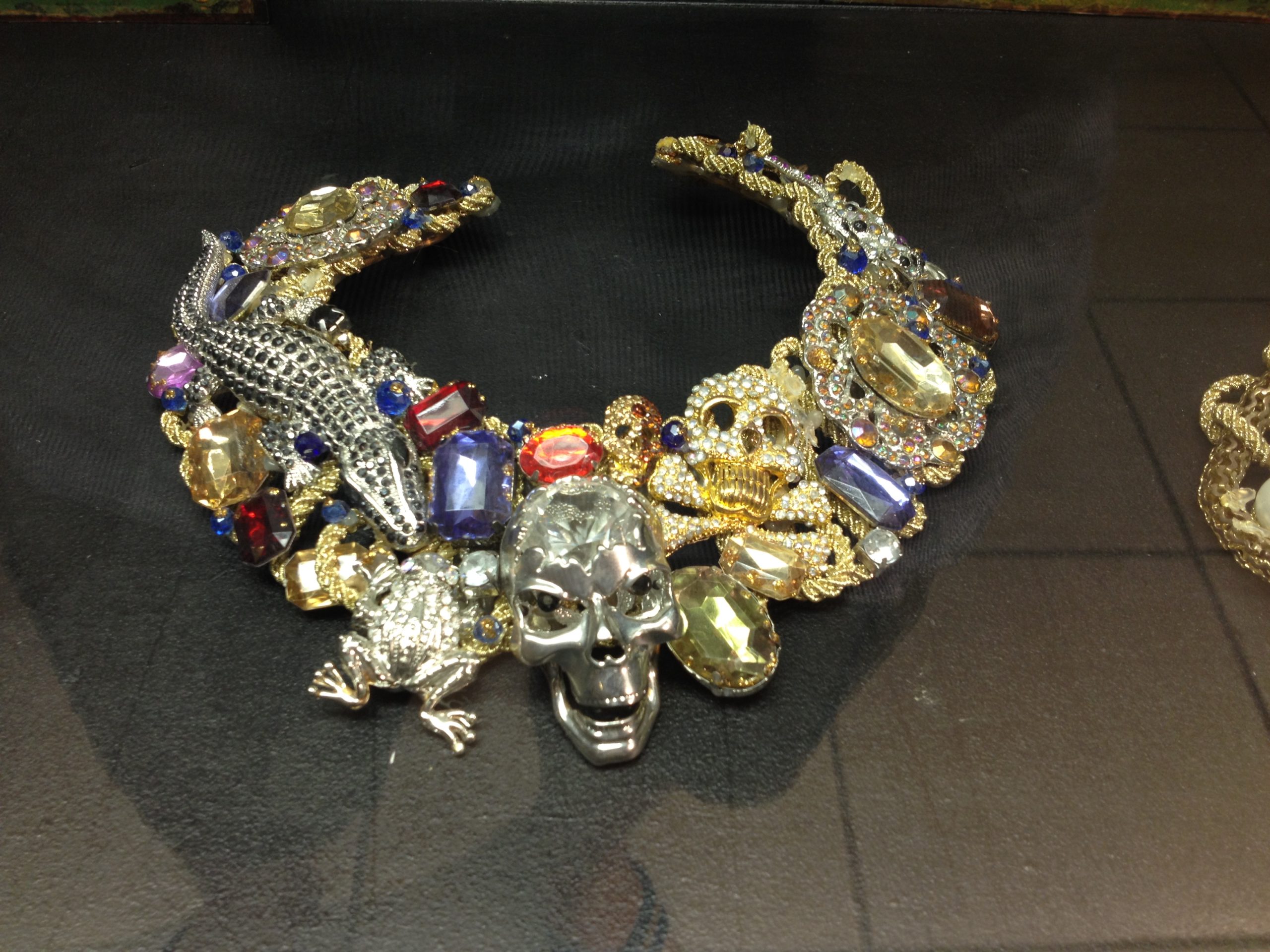Me parecen muy atrevidos, agresivos, transgresores. Uno de ellos, todos son de gran porte. Uno mezcla una calavera con un sapo, una mariposa negra y un cocodrilo. Otro, dos cabezas de tigre, dos coronas, una serpiente, una lagartija, un sapo, y un tercero con calaveras, sapos y un cocodrilo. Lo que mas me llama la atención es el colorido y vistosidad, porque están llenos de piedras de colores, entiendo que son vidrios y perlas de imitación, sobre todo están llenos de color. Con cierto aire macabro o bestial, dado la cantidad de animales que los componen. Combinan metales, creo que latón o zamac, en cordones, flores y figuras de animales con piedras y telas. ¿Es otro tipo de joyería?, ¿es la bisutería otra opción para los joyeros?