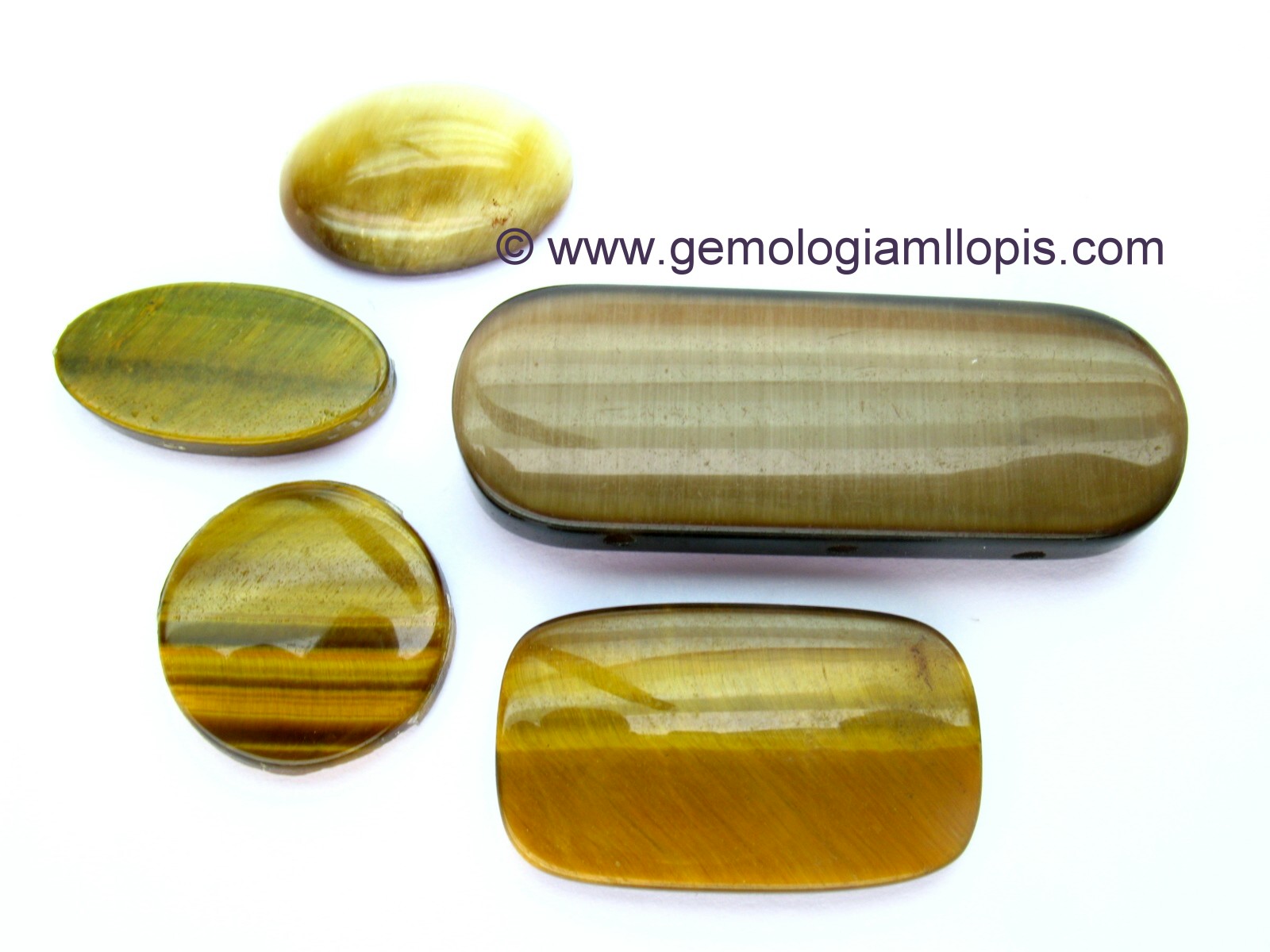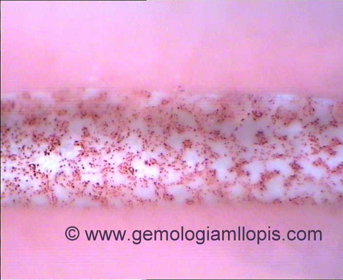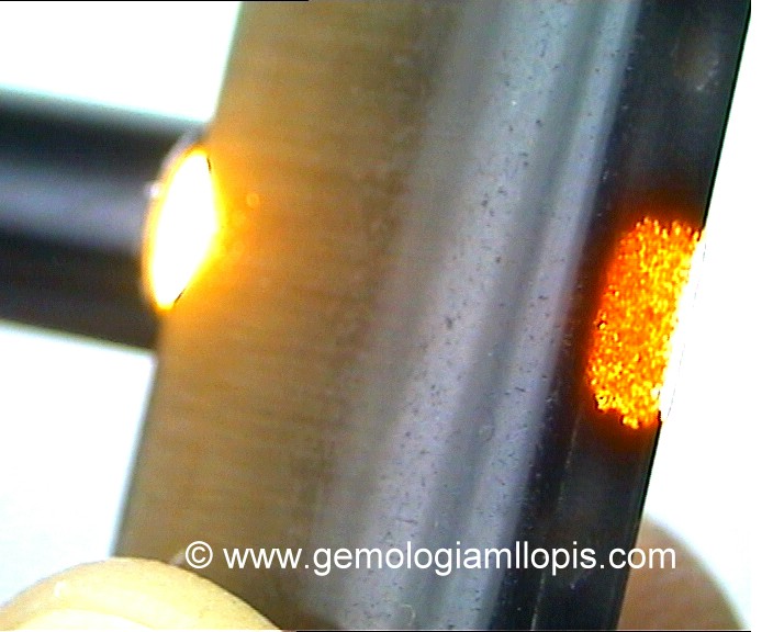 Para poder distinguirlas de cualquier piedra que tenga fibras y que pueda mostrar un efecto «ojo de gato», veréis que vistas al traslúz iluminándolas con una «fibra óptica» en sentido transversal o perpendicular a la dirección de las fibras, se aprecia que es traslúcida difusa, pasa la luz de forma difusa, no es así en una piedra normal, como por ejemplo un cuarzo ojo de tigre, en el que es opaco. Pero si iluminamos siguiendo la dirección de las fibras, resulta, que la fibra óptica, ya es en si misma un manojo de fibras de vidrio aglutinadas en paralelo y en contacto con una fuente de luz (lámpara), resulta que la luz continua transmitiéndose de la misma manera por las fibras de la piedra. Esto no ocurre de ninguna manera en un material natural.