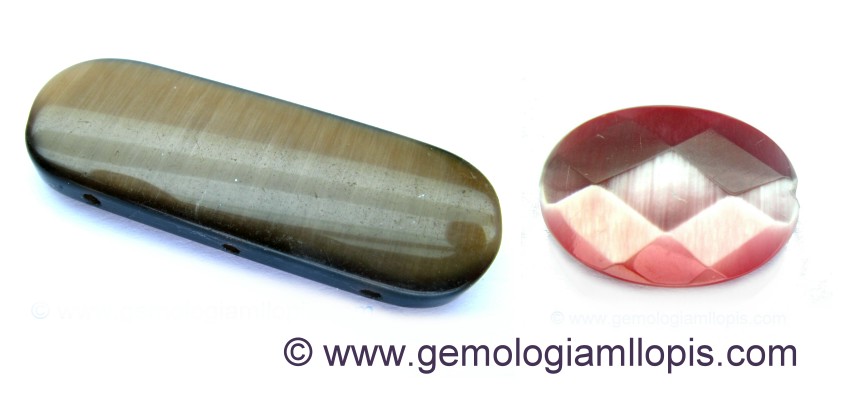 Generalmente la fibra de vidrio y/o la fibra óptica es incolora, en estos ejemplos podréis ver que el aglutinante que las une se ha tintado de marrón en la que imita al cuarzo ojo de tigre y el otro de color rosa que le da un aspecto sedoso y nacarado. Las fibras se juntan en paralelo para poder asemejar el efecto óptico del «ojo de gato« de algunas piedras si se talla en cabujón como es este el caso.