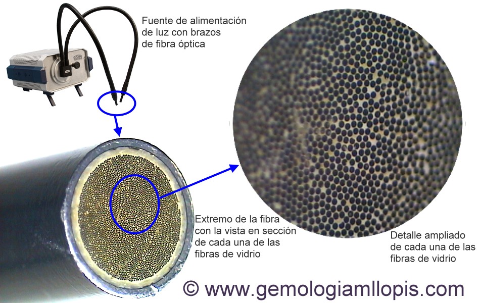 Hemos visto muchas imitaciones de piedras de color con vidrios. Los azules para imitar a zafiros, los verdes para imitar a esmeraldas, los rojos para imitar a rubíes, etc. Hasta la fecha todas son piedras transparentes con mas o menos inclusiones, que generalmente son burbujas que para los ojos de un profano se pueden parecer a las inclusiones de las piedras naturales a las que imitan, pero con una lupa gemológica 10x y sabiendo mirar, nos daremos cuenta enseguida de que es una imitación en vidrio. Ahora le ha llegado el turno a la fibra óptica, es decir fibra de vidrio con la que se fabrican gemas.