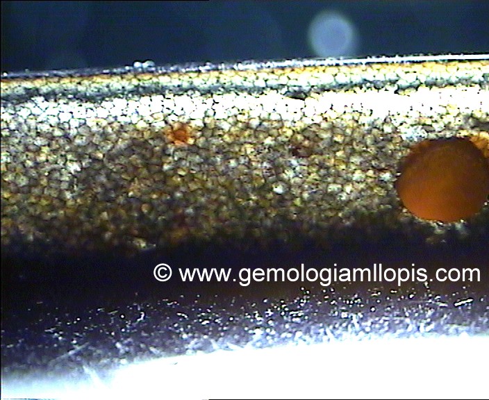 Sección lateral del borde de la cuenta doble cabujón oval, vista al microscopio 30x, mostrando los extremos de las fibras y el aglutinante de color marrón entre ellas.
