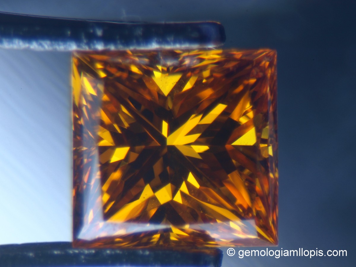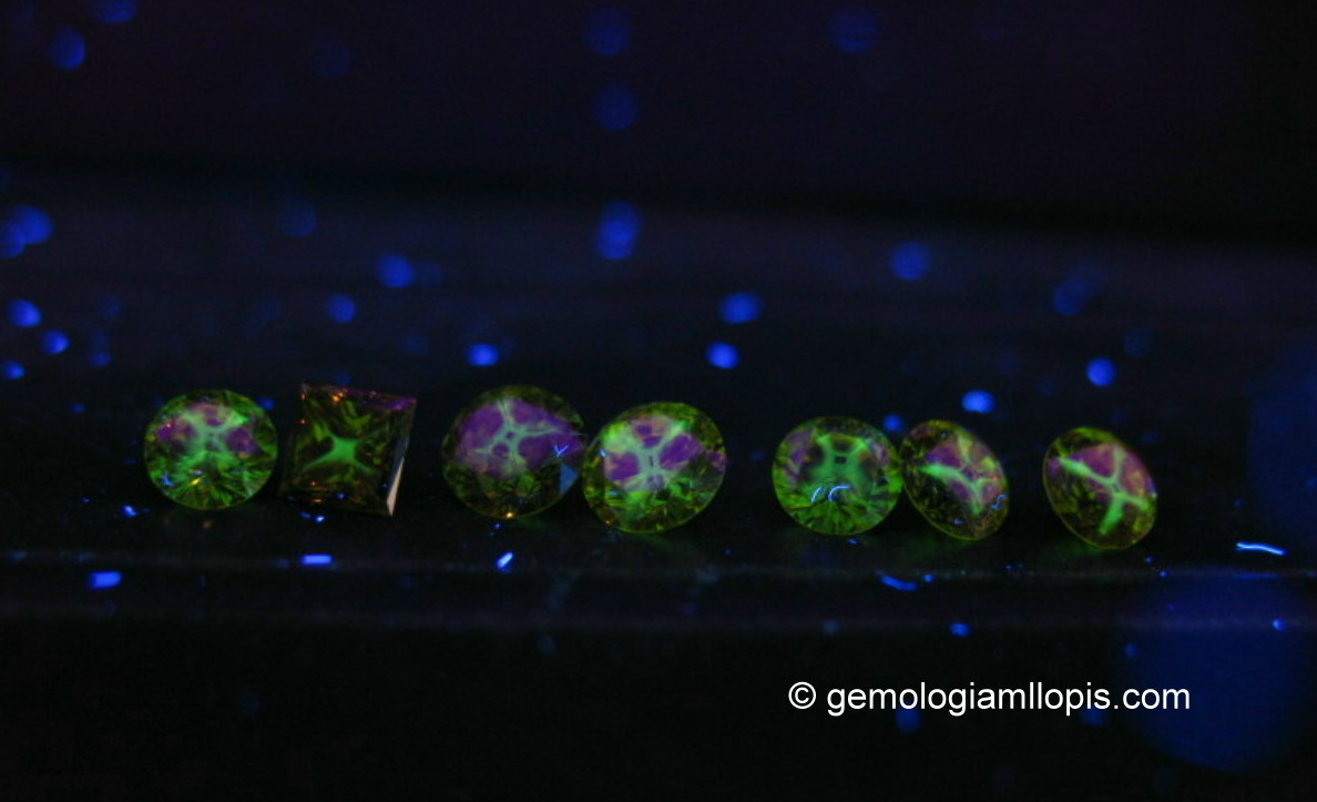 La fluorescencia de este diamante sintético es la típica de los sintéticos fabricados por el método HPHT. Podemos ver cómo esta piedra presenta el patrón de fluorescencia en forma de cruz, típico de este tipo de diamantes sintéticos.