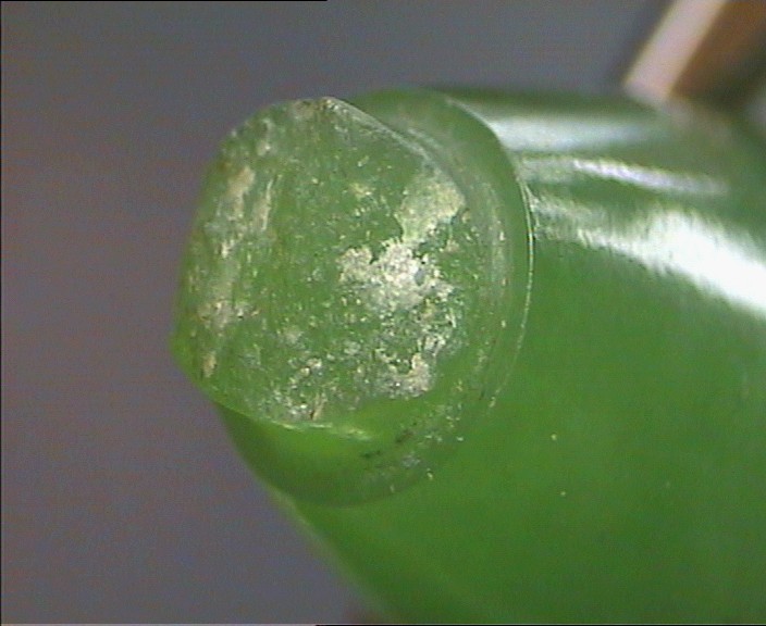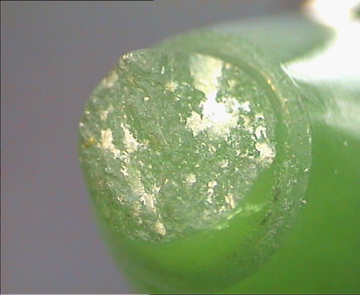 La misma fractura del jade nefrita anterior desde otra perspectiva. Luz reflejada, 30X.