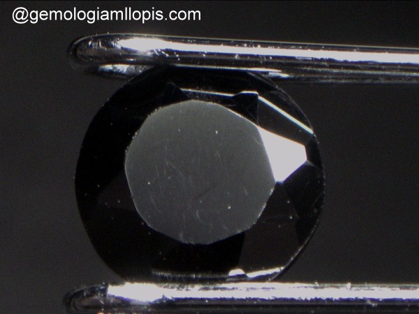 La gema de color negro que seleccionamos estaba tallada en estilo brillante modificado, medía 5,00 mm X 3,70 mm y pesaba 0,631 ct. El ejemplar tenía un brillo muy elevado, podríamos definirlo casi como submetálico. Al observar la piedra con el microscopio vimos que algunas de las pequeñas fracturas que tenía eran concoideas, mientras que otras parecían más bien de tipo granular, en ambos casos el brillo de la fractura era céreo.