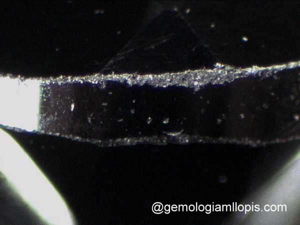 El filetín de la gema mostraba algunas fracturas concoideas pequeñas y otras que podían ser de tipo granular o incluso bordes desgastados.