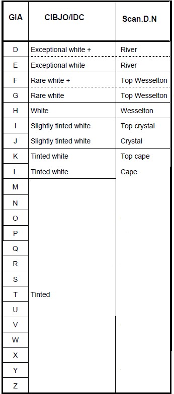 La escala de color es otro aspecto de la graduación del color de los diamantes a tener en cuenta. La práctica habitual tradicionalmente describía los grados usando denominaciones metafóricas como “River”, también los designaba por el nombre de la localidad en la que ese color se encontraba más a menudo, por ejemplo las denominaciones “Wesselton” o “Top Wesselton” están relacionadas con la mina Wesselton en Sudáfrica. Esta escala es conocida como Scan.D.N., y con el tiempo llegó a emplearse junto con una escala basada en letras como “A”; “AA”. Pero, al principio de la década de los 70, la escala que comenzaba en la “A” había degenerado y existía gran confusión respecto al color en el comercio de diamantes. En esos momento, el Gemological Institute of America (GIA) introdujo una nueva escala basada en letras que comenzaba con la “D” (para no dar lugar a confusión) y terminaba en la “Z”. La llamada escala de color D-Z fue ampliamente admitida, aunque, como GIA dice, muchos laboratorios que utilizan esta escala no siguen los procedimientos operativos estandarizados que la respaldan.