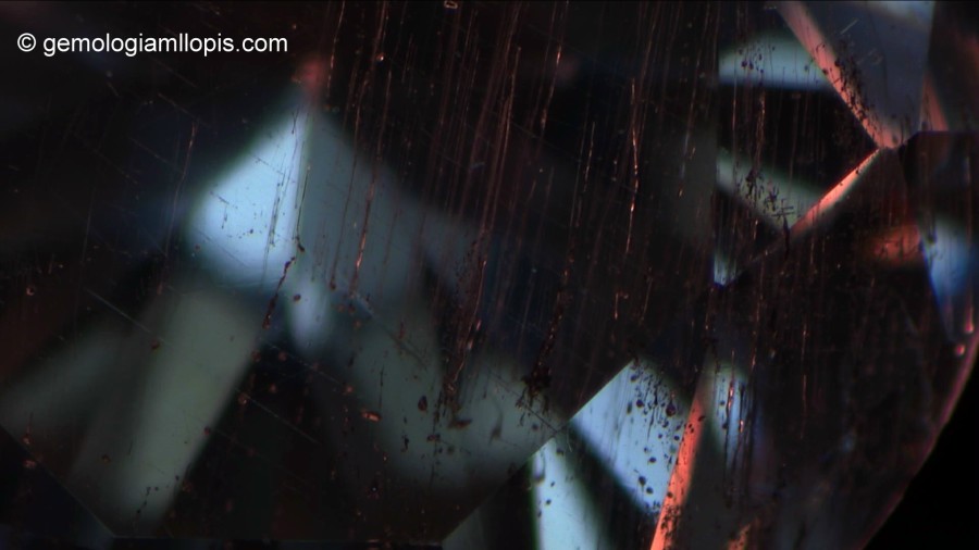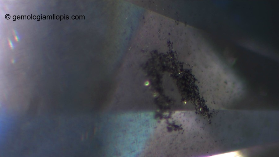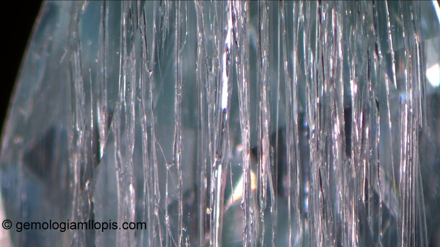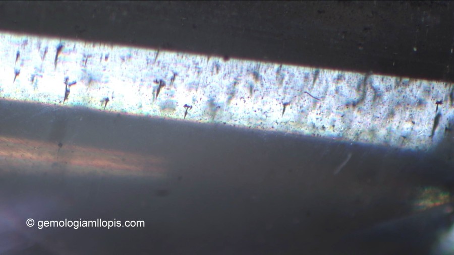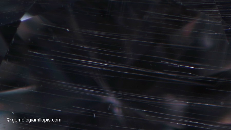Sin embargo, cuando observamos de perfil con el microscopio gemológico el mismo ejemplar vemos que, además de esas inclusiones sólidas y sin forma cristalina de color negro, tiene inclusiones con forma de «hilo» más o menos paralelas que forman un panorama interno inusual en los diamantes.