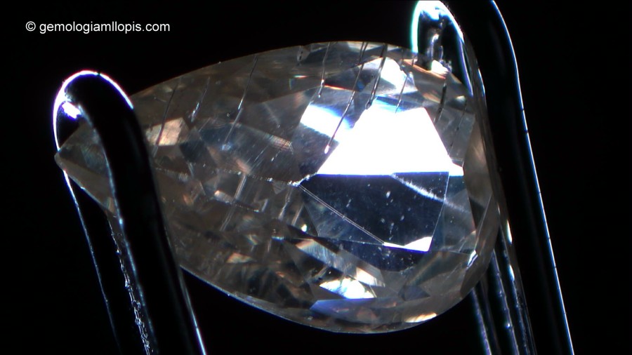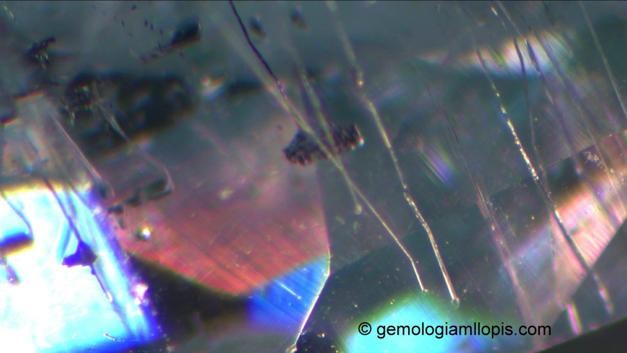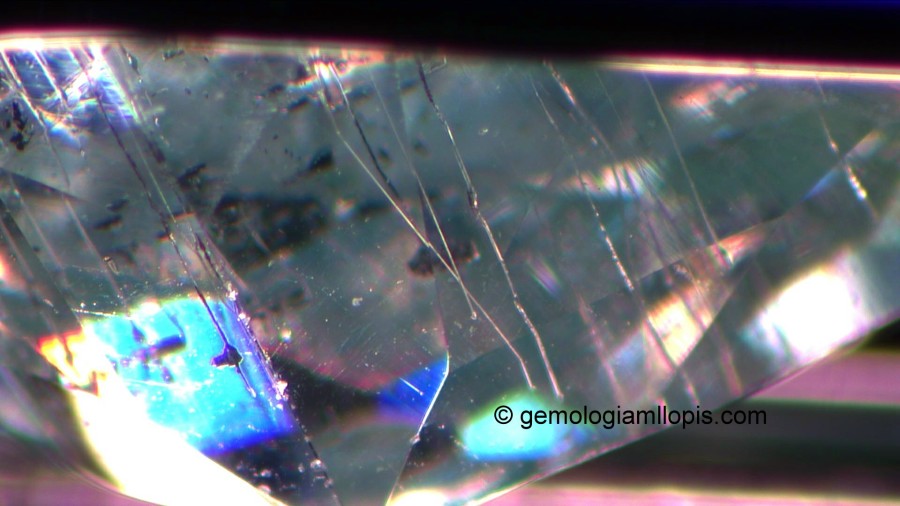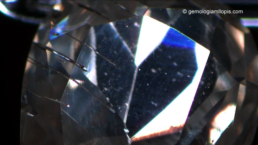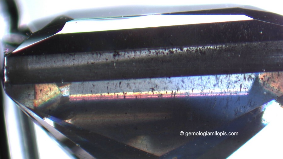 En este otro caso tenemos una moisanita sintética casi incolora con un ligero matiz amarillo, similar al de muchos diamantes, que presenta tubos finos alargados y desdoblamiento de las aristas de la culata debido a su elevada birrefringencia. Al observar estas característica podemos afirmar, sin ninguna duda, que no es un diamante.
