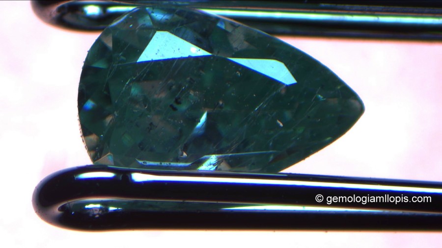 La moisanita sintética de color verde azulado suave que vemos a continuación tiene inclusiones sin aparente forma cristalina de color negro que pueden confundirnos a simple viste con las inclusiones negras que tienen algunos diamantes.