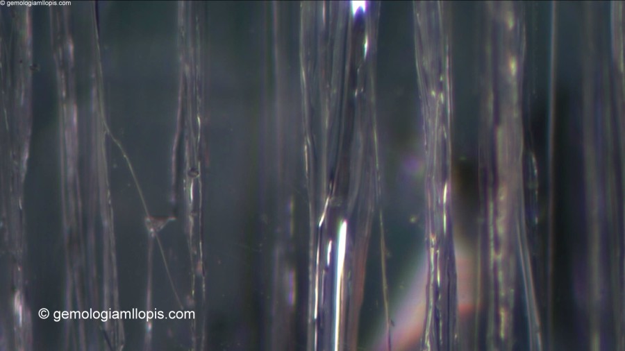 Inclusiones alargadas y finas en una moisanita sintética de color azul claro. Luz de campo oscuro y reflejada. 50x.
