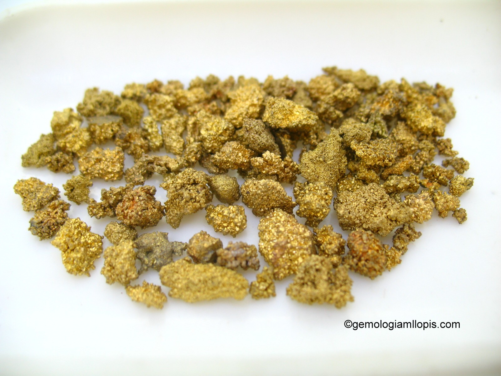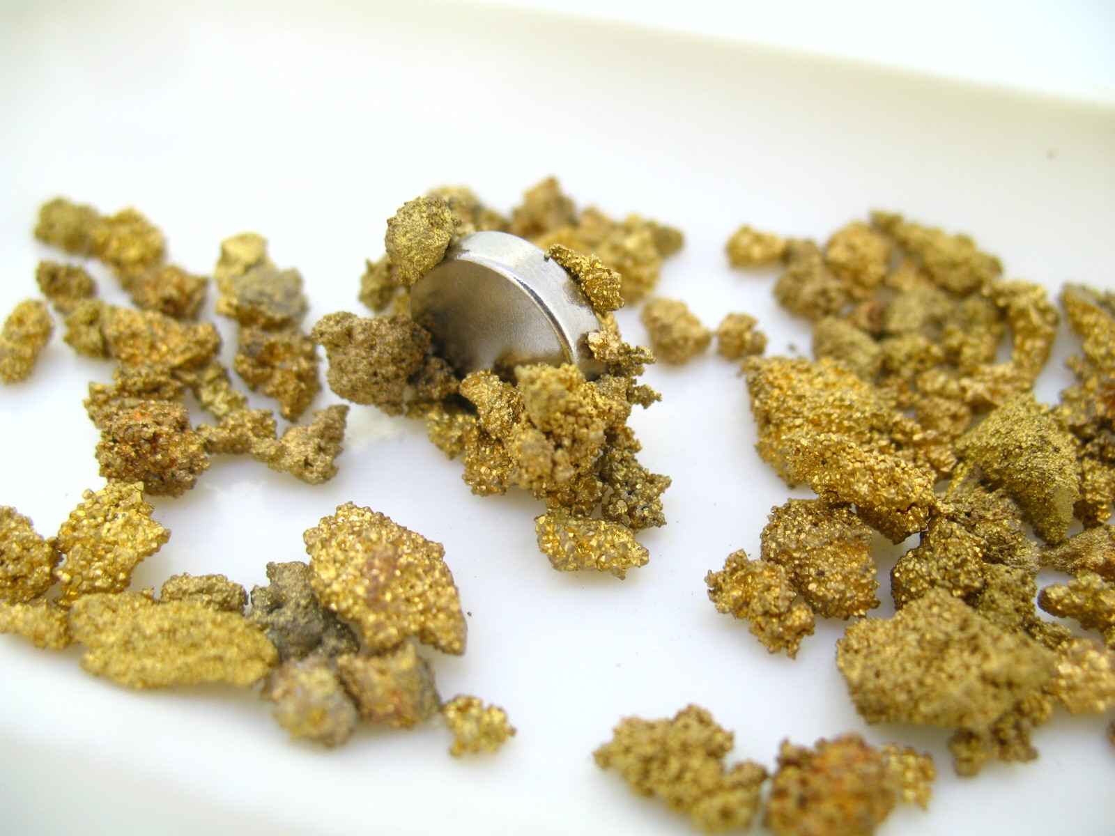 Un cliente nos trae unas muestras de un supuesto oro nativo. Nuestro cliente que al mismo tiempo es un alumno, pudo realizar él mismo las pruebas necesarias para evidenciar el fraude que se le venía encima. A la vista de las muestras le aplicó un pequeño imán de neodimio que fue alarmante al ver que los gránulos  eran atraídos fuertemente por el imán.  A continuación le hizo una prueba de densidad con balanza hidrostática y dio un peso específico de 7,8 . Con la piedra de toque y los ácidos, se borraban  las marcas de rayas en la piedra. Al limar con una lima gruesa dejó ver su colo blanco acero.   Como consecuencia de estas pruebas, el fraude quedó evidenciado.   Se trata de gránulos de acero con un recubrimiento o baño de dorado sin contenido en oro.