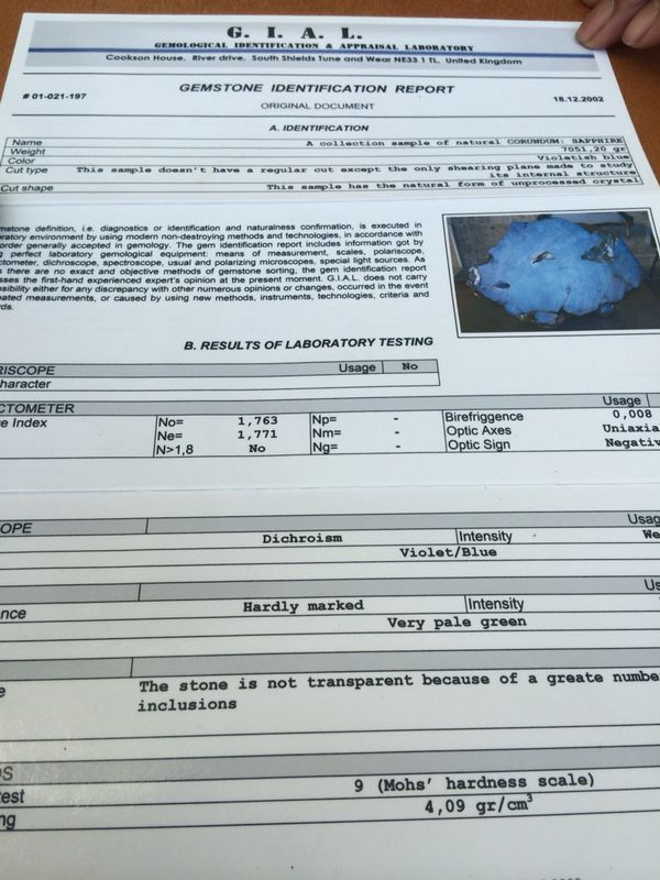Se trata de un ejemplar en bruto, sin tallar, masivo y compacto de espinela de 7 051 g de peso con una cara serrada, se aprecian las marcas del disco de sierra. Adjuntaban con el mineral un documento emitido por un laboratorio llamado G.I.A.L. , en mi opinión , nombre confuso por aquello de que GIA es el Instituto Gemológico Americano, de fama y prestigio internacional, que no tiene nada que ver con este laboratorio. Además la dirección del laboratorio emisor del certificado no existe, se puede comprobar con el Google Maps y el Srteet View.