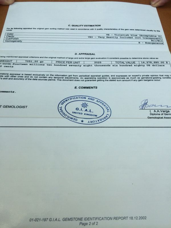 No les ha temblado el pulso al indicar en su certificado que vale, la friolera de 14.278.680 dólares americanos. Obteniendo esta cifra como resultado de la multiplicación de 7051,20 gramos por 2021 $/g.
